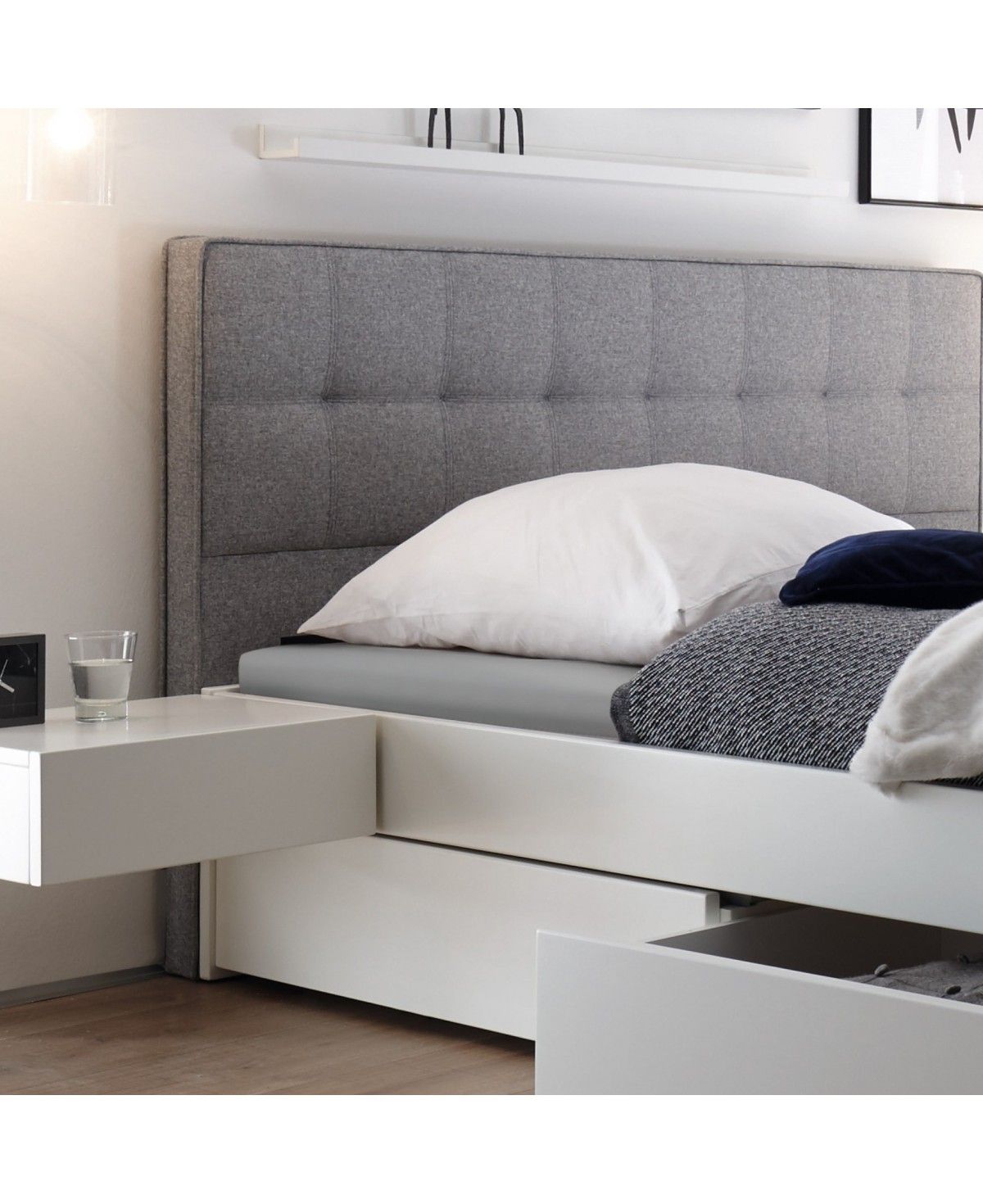 Das gepolsterte Kopfteil in der Farbe grigio sorgt für einen tollen Kontrast zum zurückhaltend gestalteten Bettdesign. Weich und angenehm auf der Haut sieht das großflächige Kopfteil nicht nur gut aus, sondern fühlt sich auch richtig gut an.