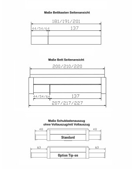 Bellissimo bietet Ihnen die Wahl zwischen dem Standard Schubladenauszug mit Softclose Einzügen von Blum (serienmäßig im Lieferumfang enthalten), oder dem Tip-On Vollauszug (gegen Aufpreis) - ebenfalls mit Softclose. Beim Tip-On Vollauszug können die Schubladen komplett unter dem Bett hervorgezogen werden - der Stauraum kann ohne Einschränkung benutzt werden. Die Öffnung und das Schließen der Schublade erfolgt mit einem Druck auf die Front - schon kommt Ihnen die Schublade ein Stück entgegen bzw. arretiert in der geschlossenen Position.