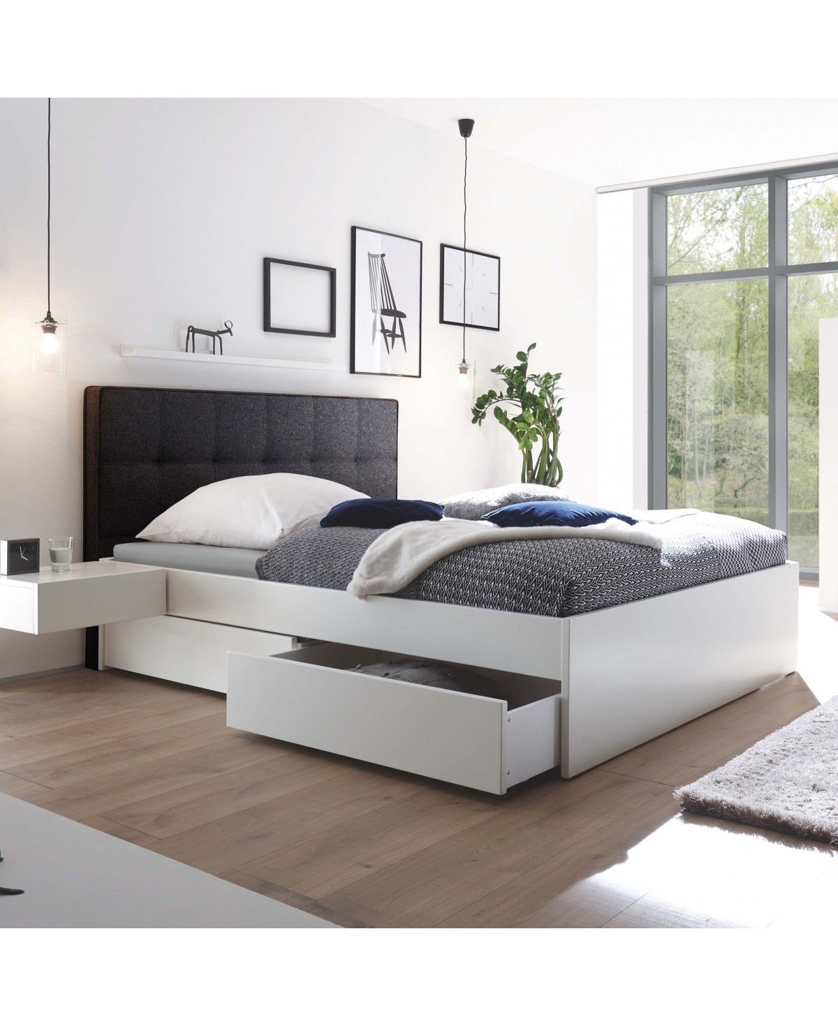 Schaffen Sie zusätzlichen Platz in Ihrem Schlafzimmer mit dem modernen Hasena Stauraumbett Otello und seinen vier geräumigen Schubladen. Die frische Kombination aus weiß deckend lackiertem Holz und dem weich gepolsterten Rückenteil, bezogen mit hochwertigem Webstoff in der Farbe anthrazit 328, schafft ein tolles Raumambiente bei gleichzeitig bester Funktionalität. Die insgesamt vier Schubkästen (zwei links, zwei rechts) schaffen viel Platz unter dem Bett und bieten auch in kleineren Schlafräumen einen echten Mehrwert um den kostbaren Platz sinnvoll nutzen zu können.