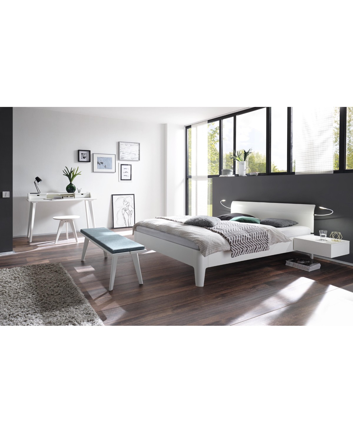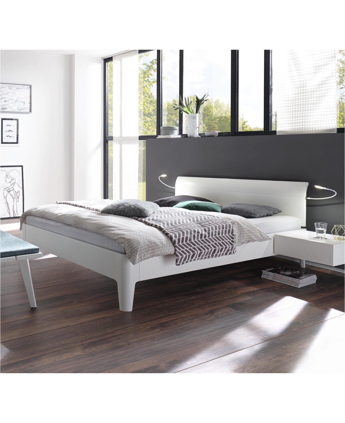 • Lieferung ohne Matratzen, Lattenroste, Nachttisch, Deko, Auflagen und Leselampen