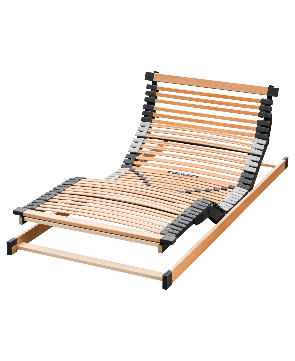 Alle Holzbestandteile des Lattenrostes sind aus stabilem Buchenschichtholz gefertigt. Das sorgt für eine hohe Stabilität und Langzeitqualität. 42 mehrschichtig verleimte Buchenholzfederleisten sind in elastischen Trio-Kautschukkappen in einer festeren Ausführung (dunkelgrau) und einer weicheren Ausführung (hellgrau) gelagert. Der Lattenrost passt sich daher sehr gut den Körperkonturen an. Im Schulterbereich sorgen insgesamt sechs gefräste Federleisten für ein sanftes Einsinkverhalten der Schulter und eine angenehme Druckentlastung.