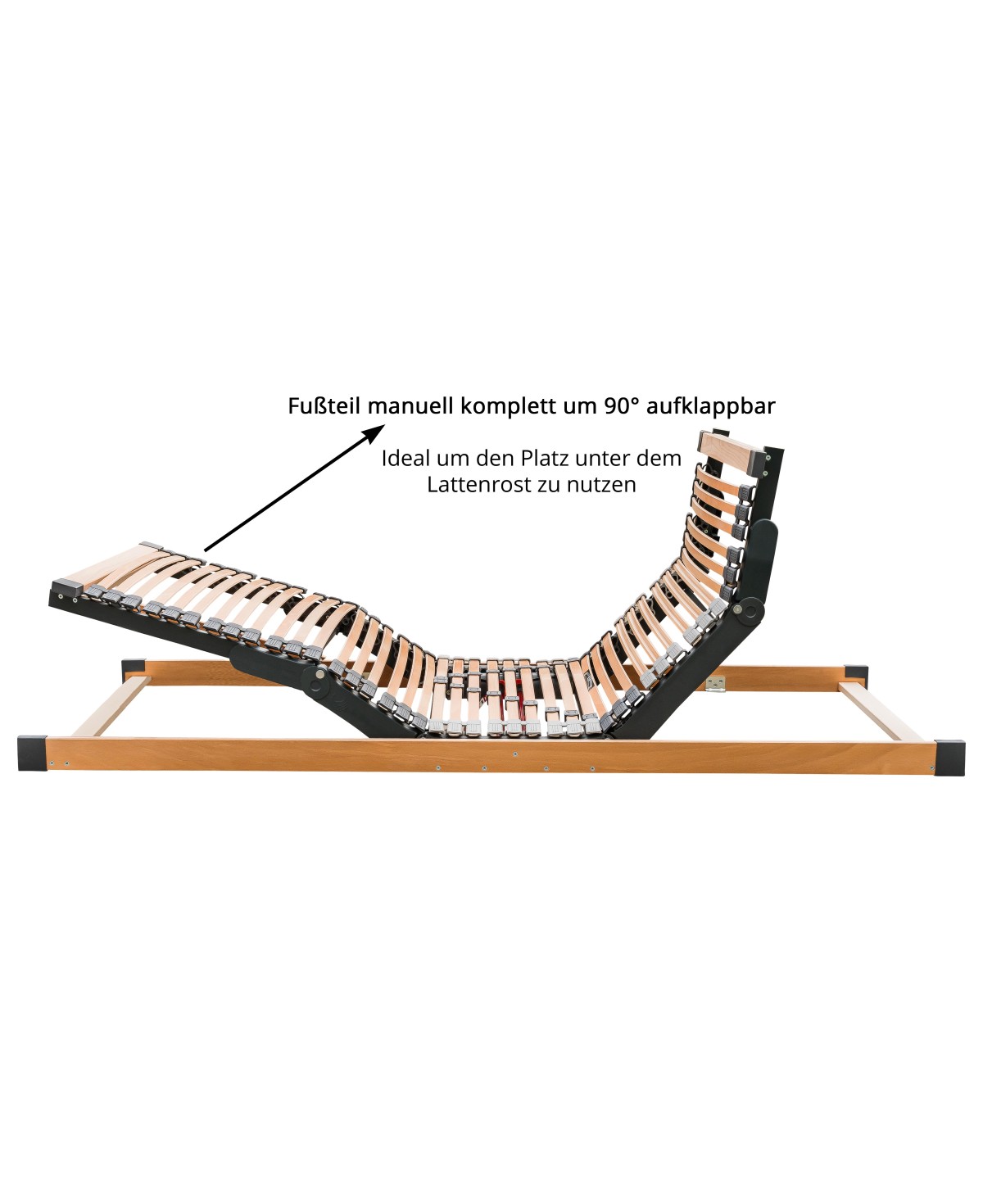 Das Fußteil ist ebenfalls zweigeteilt - in einen Wadenbereich und einen Oberschenkelbereich. Die stufenlose Verstellung erlaubt eine perfekte Abstützung durch den Knieknick. Die Beine werden durch die vollflächige Auflage spürbar entlastet. So kann auch zu Hause ein bequemes Stufenbett eingestellt werden das wunderbar entspannend wirken kann. Der unterste Teil des Lattenrostes kann ganz praktisch nach oben geklappt werden - so können Dinge die unter dem Lattenrost aufbewahrt werden sehr einfach entnommen oder darunter verstaut werden.