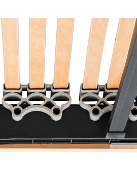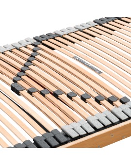 Alle Holzbestandteile des Lattenrostes sind aus stabilem Buchenschichtholz gefertigt. Das sorgt für eine hohe Stabilität und Langzeitqualität. 42 mehrschichtig verleimte Buchenholzfederleisten sind in elastischen Trio-Kautschukkappen in einer festeren Ausführung (dunkelgrau) und einer weicheren Ausführung (hellgrau) gelagert. Der Lattenrost passt sich daher sehr gut den Körperkonturen an. Im Schulterbereich sorgen insgesamt sechs gefräste Federleisten für ein sanftes Einsinkverhalten der Schulter und eine angenehme Druckentlastung.