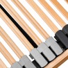 Alle Holzbestandteile des Lattenrostes sind aus stabilem Buchenschichtholz gefertigt. Das sorgt für eine hohe Stabilität und Langzeitqualität. 42 mehrschichtig verleimte Buchenholzfederleisten sind in elastischen Trio-Kautschukkappen in einer festeren Ausführung (dunkelgrau) und einer weicheren Ausführung (hellgrau) gelagert. Der Lattenrost passt sich daher sehr gut den Körperkonturen an. Im Schulterbereich sorgen insgesamt sechs gefräste Federleisten für ein sanftes Einsinkverhalten der Schulter und eine angenehme Druckentlastung.