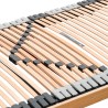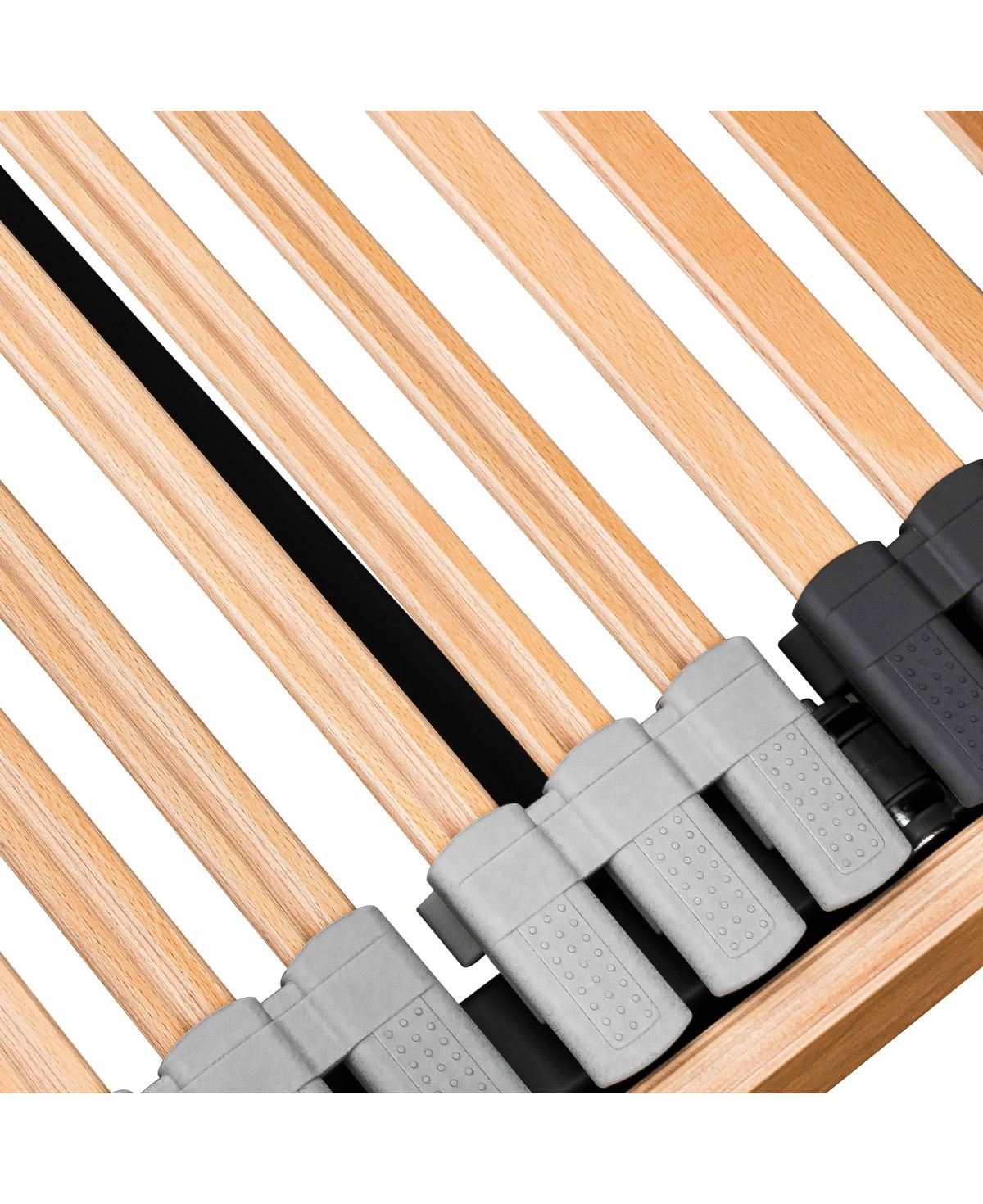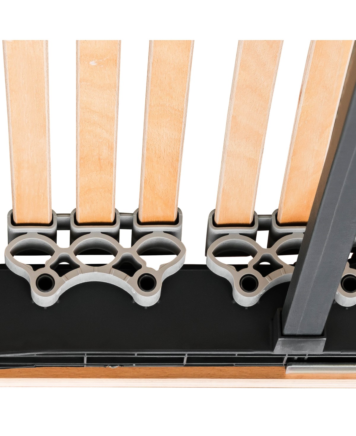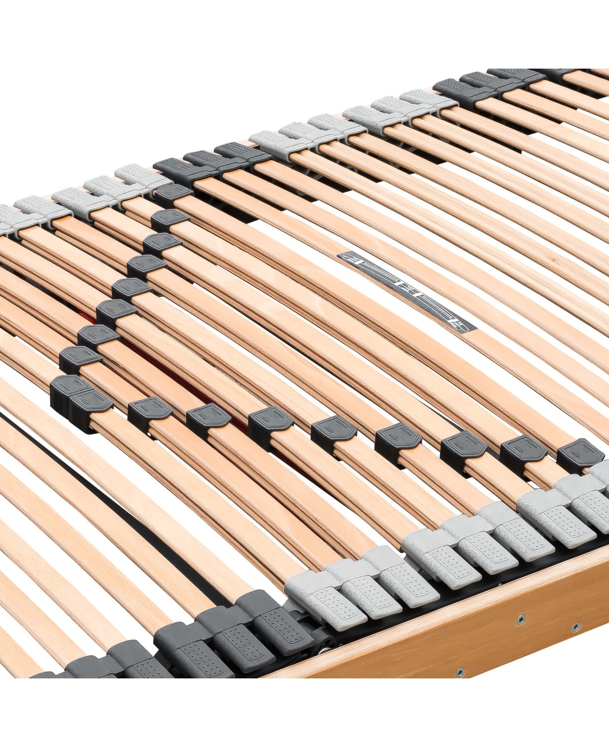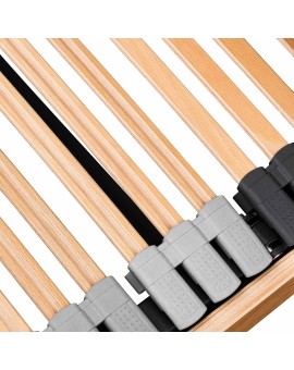 Alle Holzbestandteile des Lattenrostes sind aus stabilem Buchenschichtholz gefertigt. Das sorgt für eine hohe Stabilität und Langzeitqualität. 42 mehrschichtig verleimte Buchenholzfederleisten sind in elastischen Trio-Kautschukkappen in einer festeren Ausführung (dunkelgrau) und einer weicheren Ausführung (hellgrau) gelagert. Der Lattenrost passt sich daher sehr gut den Körperkonturen an. Im Schulterbereich sorgen insgesamt sechs gefräste Federleisten für ein sanftes Einsinkverhalten der Schulter und eine angenehme Druckentlastung.