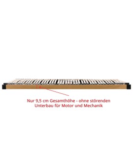 Der wartungsfreie Motor und die Verstellmechanik sind platzsparend in die Seitenholme des Lattenrostes integriert. Es wird unterhalb des Lattenrostes kein Platz für den Motor oder die Mechanik benötigt. Somit kann der Bella Motorrahmen in nahezu alle Bettkonstruktionen einfach eingelegt werden. Auch bei querverlaufenden Auflageleisten oder vorhandenen Bettkästen.