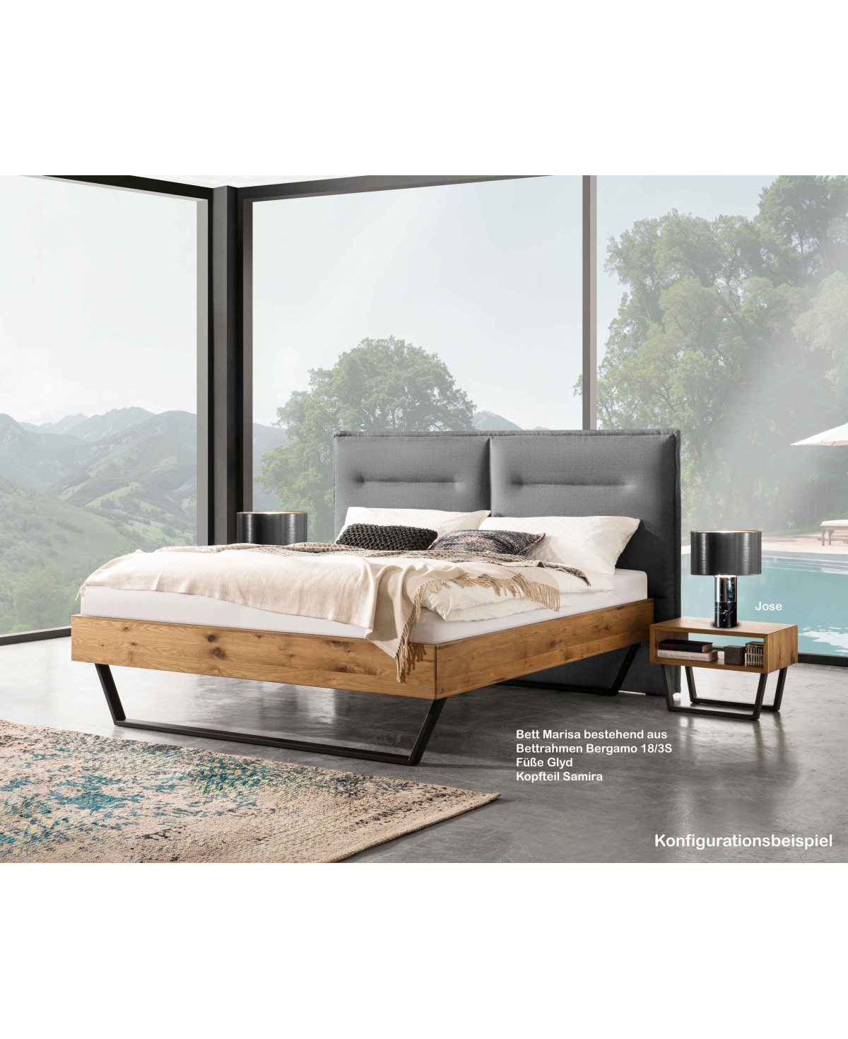• Lieferung ohne Nachttisch, Matratzen, Lattenroste, Dekoration und Auflagen