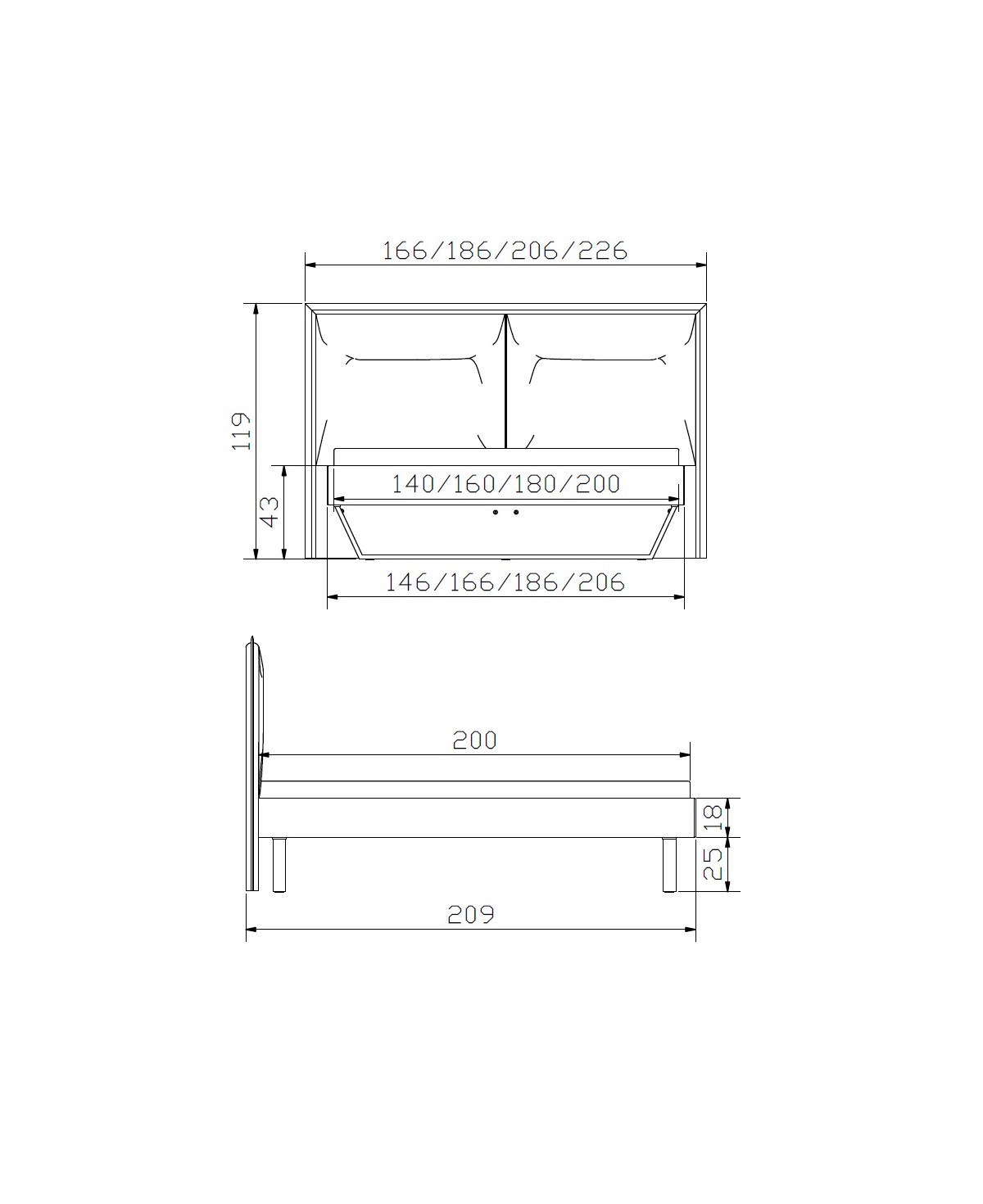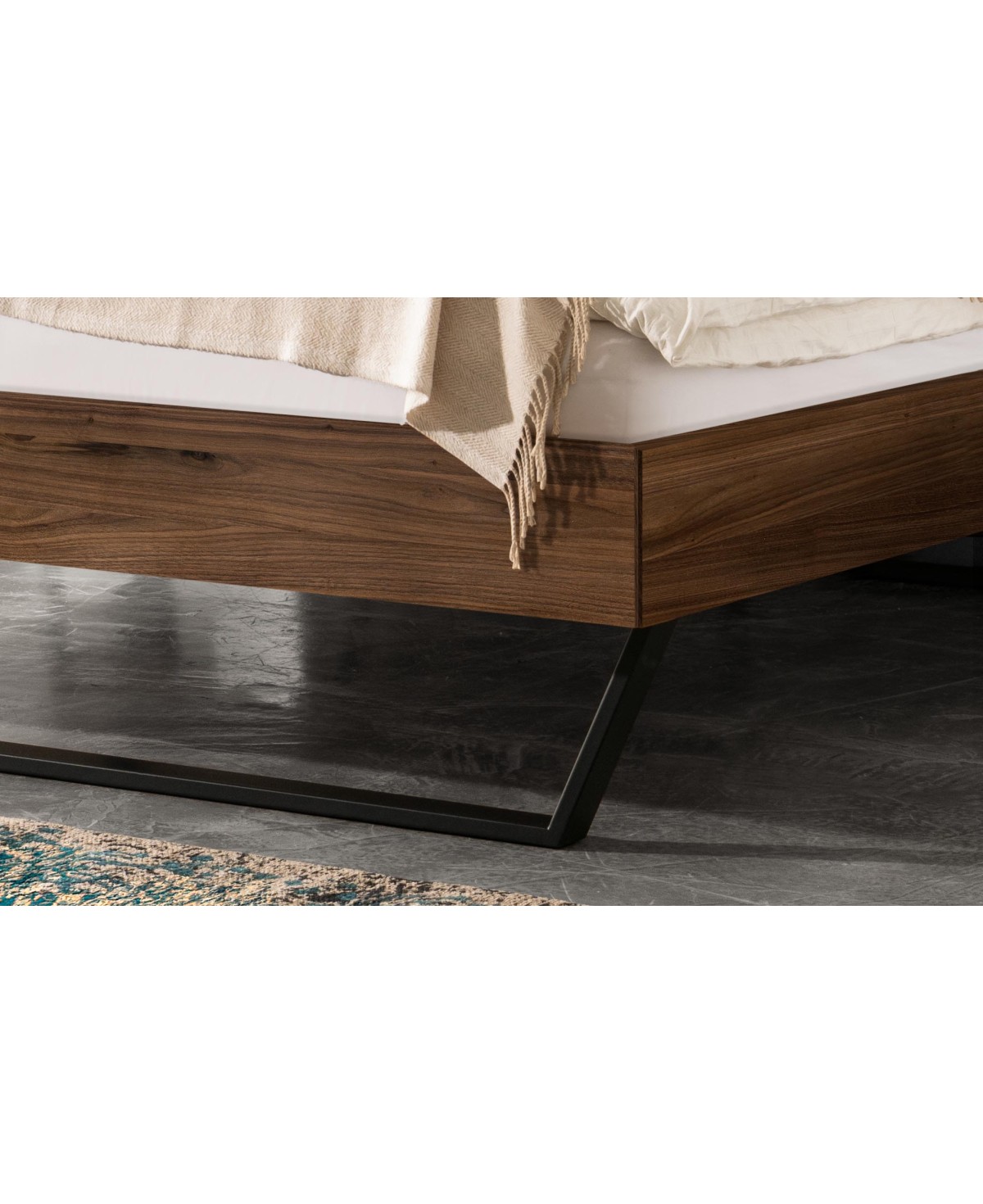 Das Design überzeugt durch seine klare, ruhige Formensprache und ein imposantes, wandpaneelartiges Kopfteil mit weichem Stoffbezug, das dem Raum eine eindrucksvolle Präsenz verleiht. Gleichzeitig sorgen stabile Metallkufen in Komforthöhe für eine schwebende Optik und unterstreichen die moderne Leichtigkeit dieses Modells.