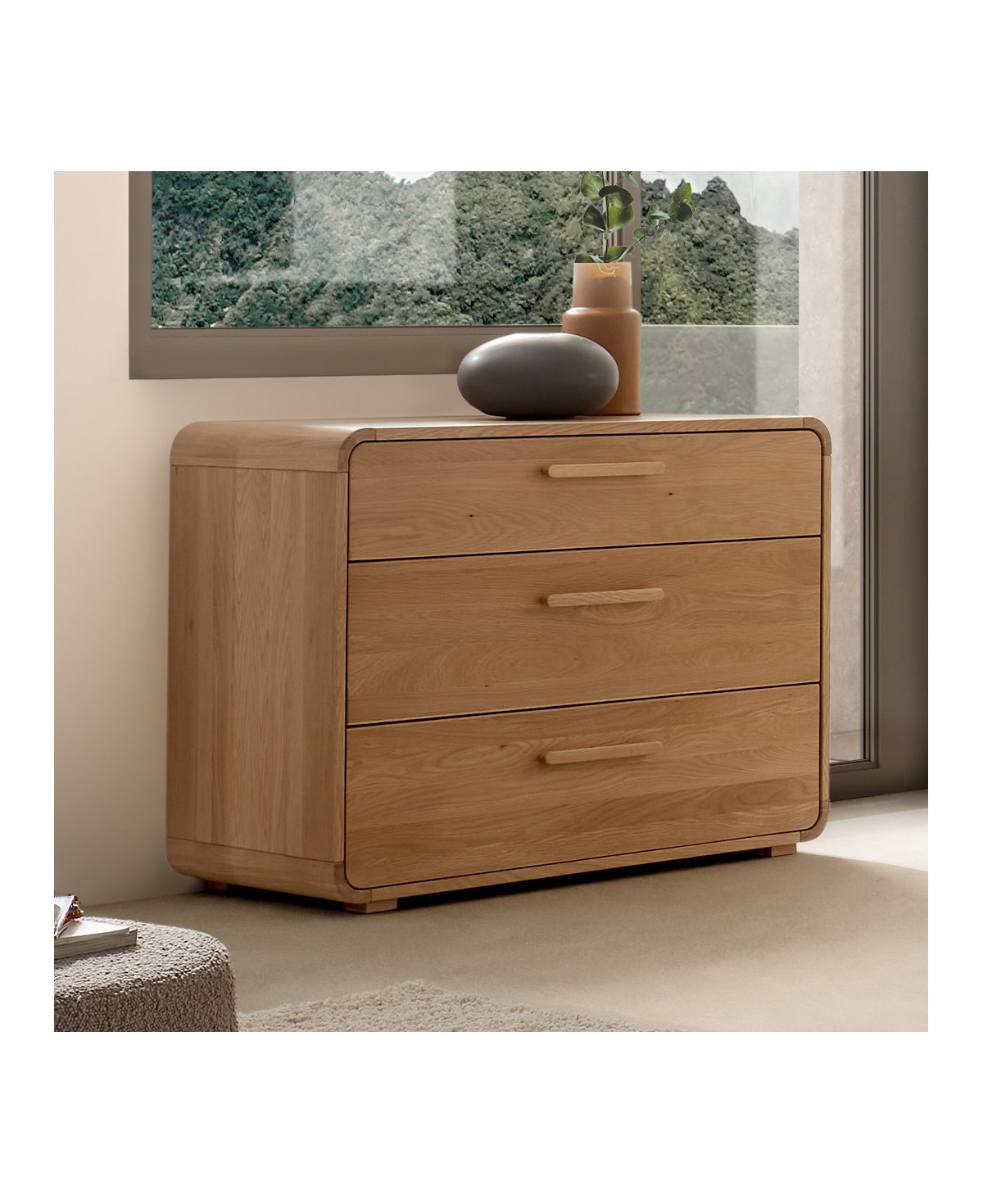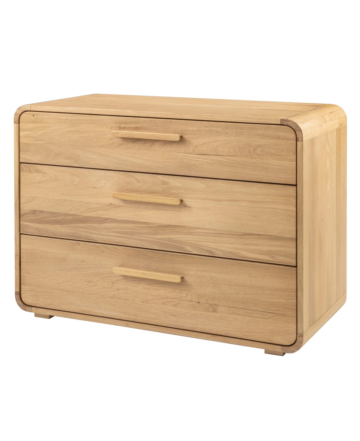 Die Hasena Kommode Comano zitiert das Design der 70er Jahre mit genau definierten Radien und Designelementen wie z. B. die abegrundeten Eckeinsätze. Durch die Verwendung hochwertigen Eichenholzes in der freundlichen Farbvariante Eiche bright, strahlt die Hasena Kommode Wärme und Gediegenheit aus. Die drei geräumigen Schubladen sind mit Softclose Auszügen von Blum ausgestattet und verwöhnen mit nahezu geräuschlosem Schließen.