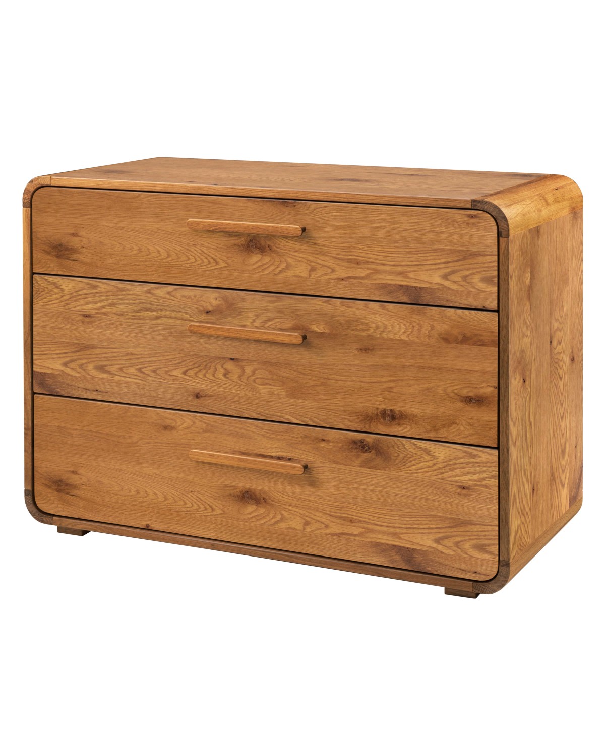 Die Hasena Kommode Comano zitiert das Design der 70er Jahre mit genau definierten Radien und Designelementen wie z. B. die abegrundeten Eckeinsätze. Durch die Verwendung hochwertigen Eichenholzes in der charakterstarken Massivholzausführung Wildeiche, strahlt die Hasena Kommode Wärme, Gediegenheit und Einzigartigkeit aus. Die drei geräumigen Schubladen sind mit Softclose Auszügen von Blum ausgestattet und verwöhnen mit nahezu geräuschlosem Schließen.
