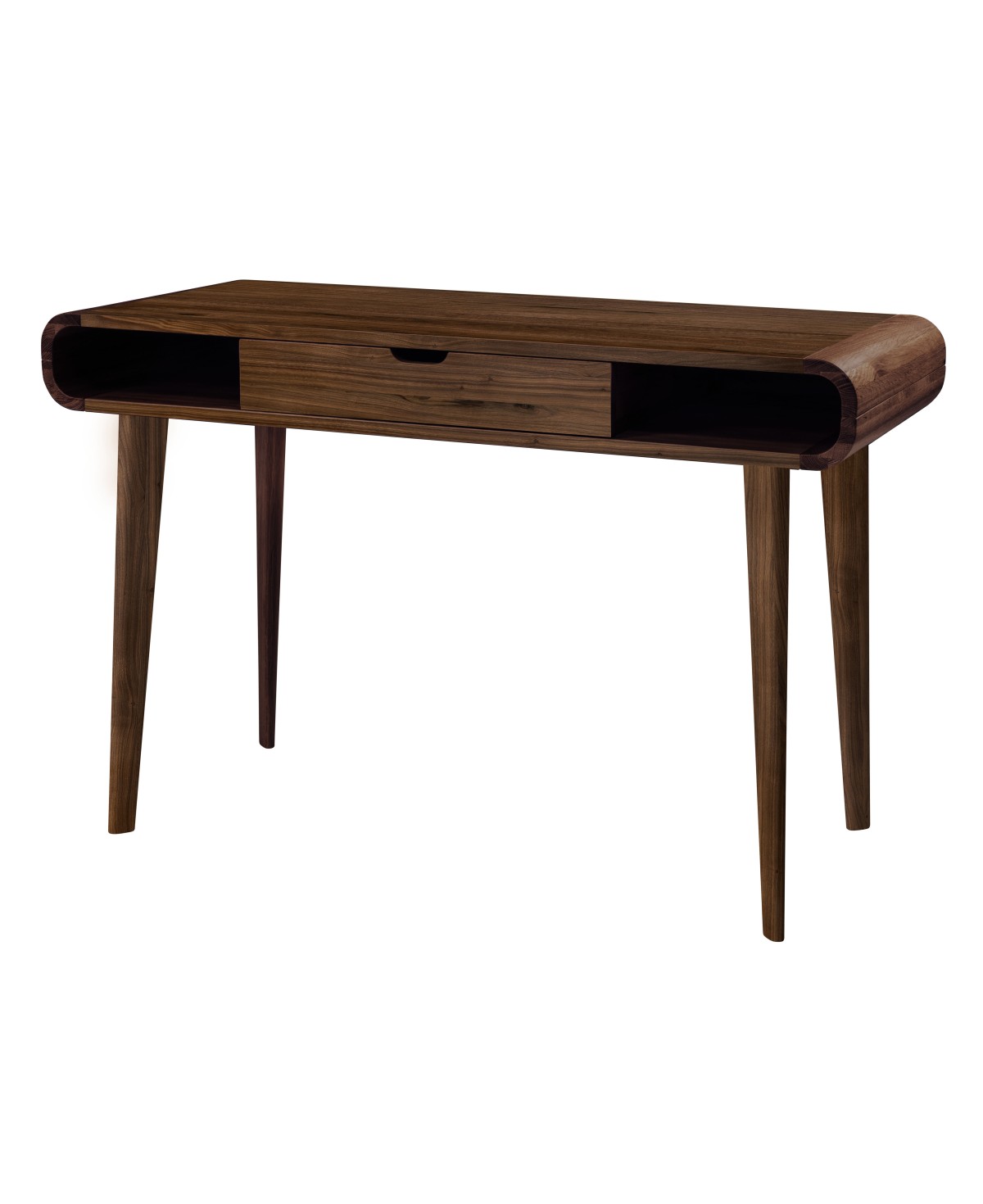 Der Hasena Schreibtisch Romano in der Ausführung Nussbaum vereint edle Materialien mit hochwertigem Design. Abgerundete Eckeinsätze und filigrane Füße sorgen für eine optische Leichtigkeit und zeitlose Eleganz. Durch die großzügige Oberfläche mit 120x50 cm bietet Romano viel Platz zum Arbeiten. Auch als Schminktisch oder schicker Ablagetisch im Schlafzimmer oder Ankleide zimmer macht der Sekretär eine ausgezeichnete Figur.