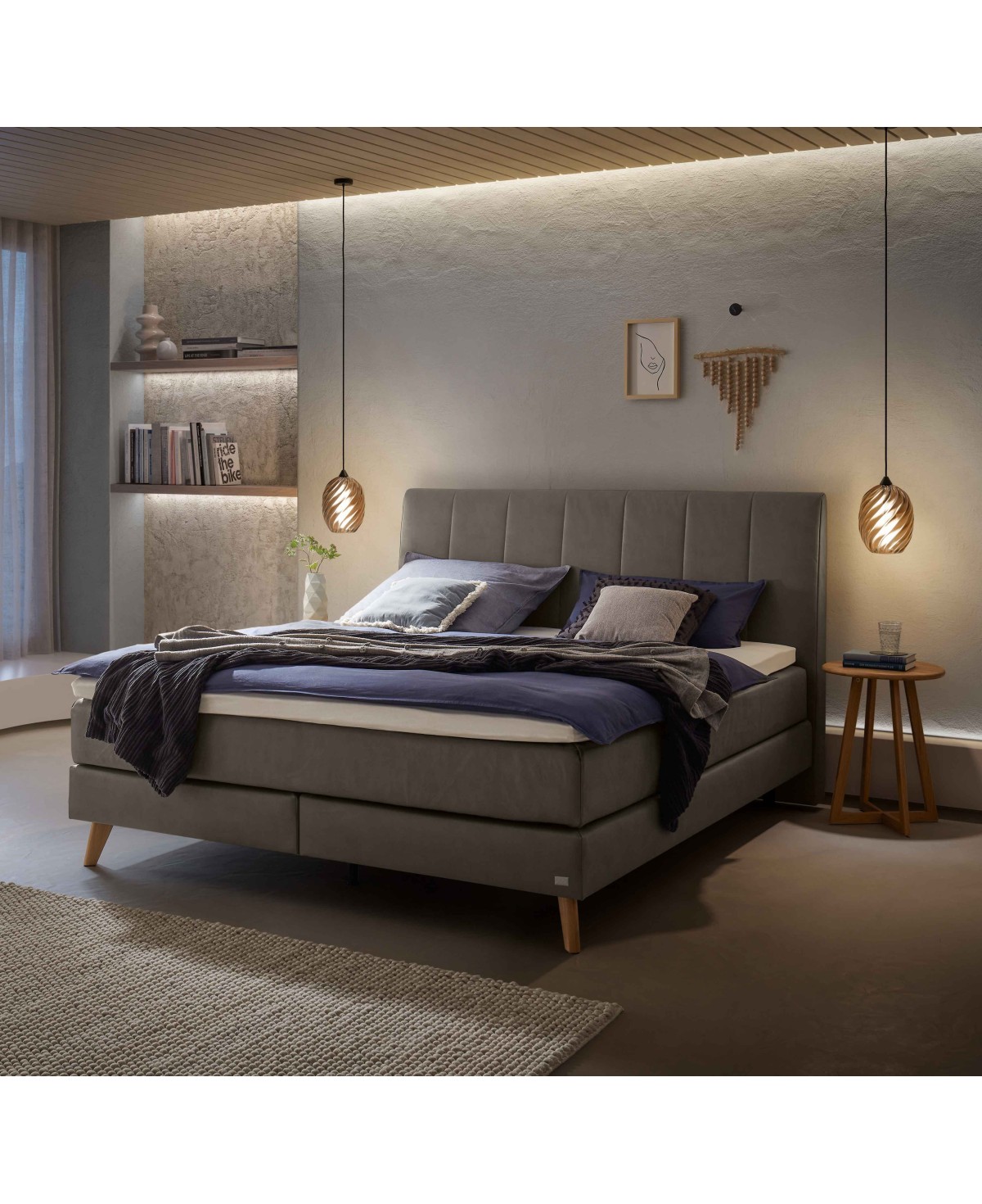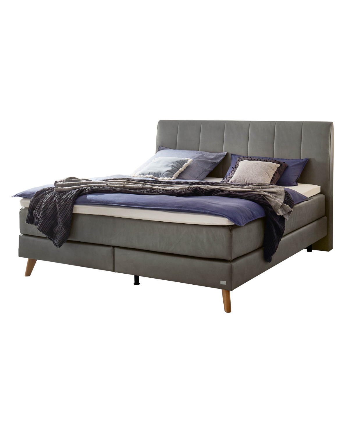 Das 115 cm hohe Kopfteil sowie die filigranen und leicht schräg verlaufenden Holzfüße in der Ausführung Eiche bright, schaffen zusammen mit der edlen Kunstlederausführung steel mit feiner Oberflächennarbung, eine tolle Wohlfühlatmosphäre. Die senkrecht verlaufende Steppung des Kopfteils sorgt für ein angenehm unaufgeregtes Design des Boxspringbettes Fernanda, das sich in viele unterschiedliche Einrichtungsstile integrieren lässt.