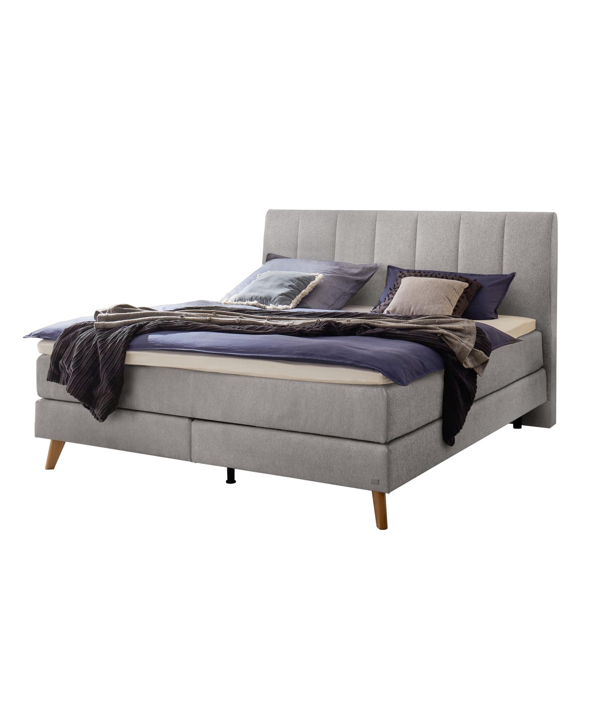 Das 115 cm hohe Kopfteil sowie die filigranen und leicht schräg verlaufenden Holzfüße in der Ausführung Eiche bright, schaffen zusammen mit dem feinen Webstoff in der freundlich hellen Ausführung light grey, eine tolle Wohlfühlatmosphäre. Die senkrecht verlaufende Steppung des Kopfteils sorgt für ein angenehm unaufgeregtes Design des Boxspringbettes Fernanda, das sich in viele unterschiedliche Einrichtungsstile integrieren lässt.