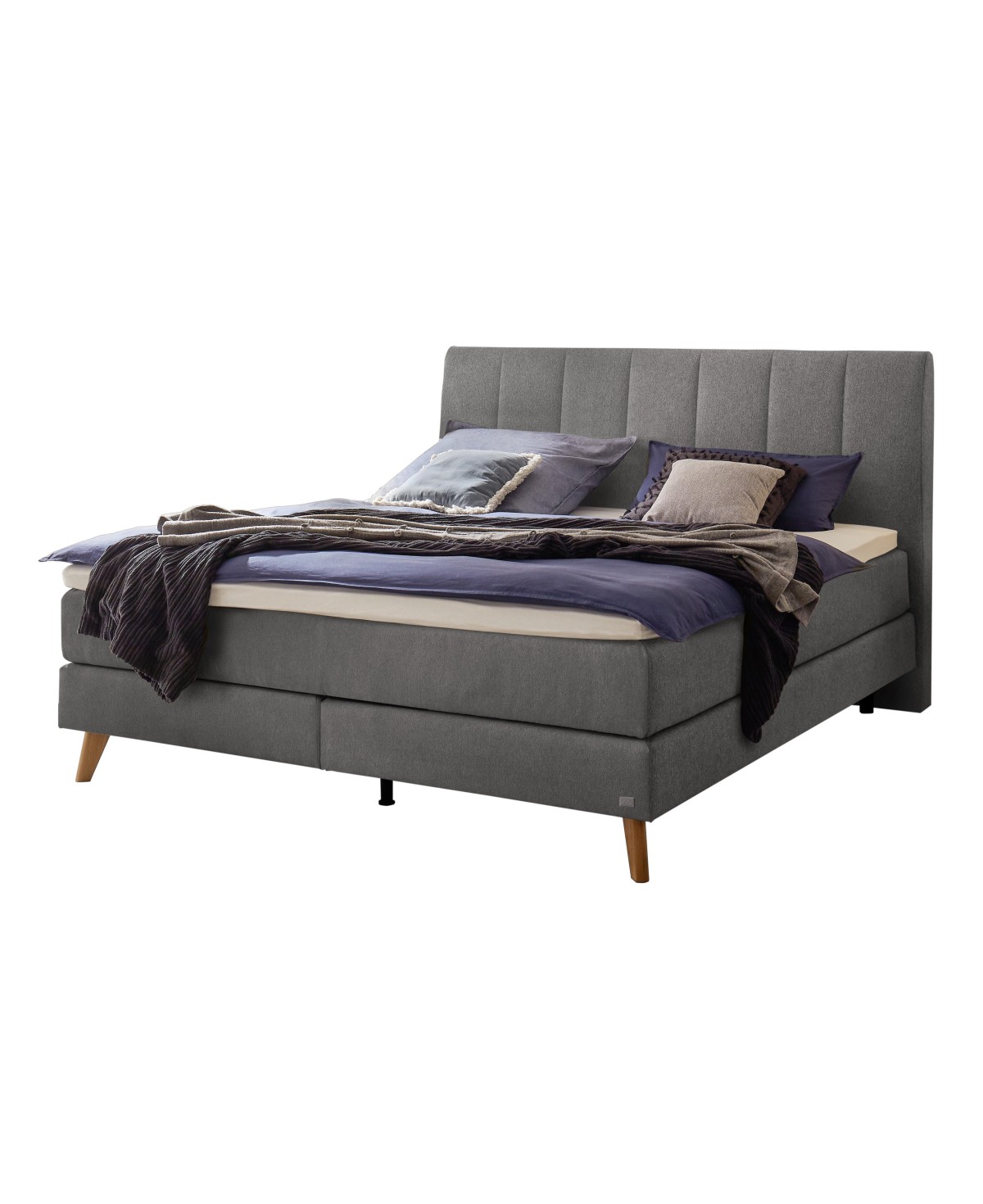 Das 115 cm hohe Kopfteil sowie die filigranen und leicht schräg verlaufenden Holzfüße in der Ausführung Eiche bright, schaffen zusammen mit dem feinen Webstoff in der eleganten Ausführung grey, eine tolle Wohlfühlatmosphäre. Die senkrecht verlaufende Steppung des Kopfteils sorgt für ein angenehm unaufgeregtes Design des Boxspringbettes Fernanda, das sich in viele unterschiedliche Einrichtungsstile integrieren lässt.