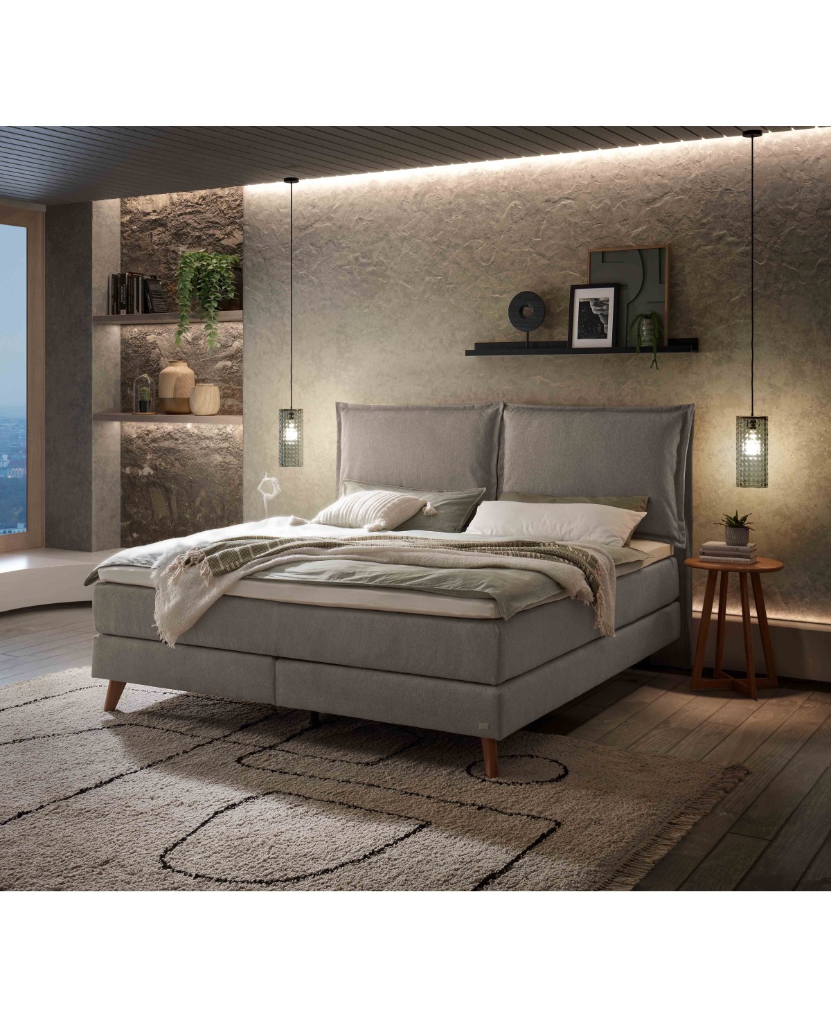 Das hohe Kopfteil mit den opulenten Kissen sowie die filigranen und leicht schräg verlaufenden Holzfüße in der Ausführung Eiche bright, machen das Hasena Boxspringbett Ricarda zu einem tollen Hingucker. Der weiche Webstoff ist wunderbar hautsympathisch und sorgt in der edlen Ausführung grey für pure Eleganz im Schlafzimmer. Die Kissen sind mit einem Klettverschluss am Paneel befestigt. So wird ein Verrutschen verhindert und sie können bei Bedarf auch abgenommen werden. Die flauschige Füllung aus Watte lädt zum entspannten Anlehnen ein.