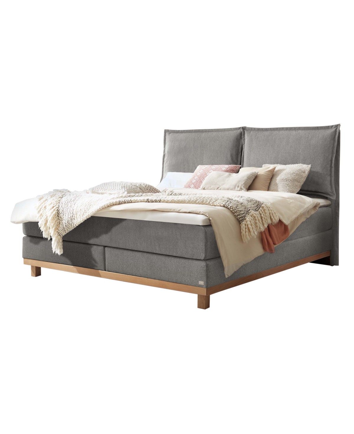 Das hohe Kopfteil des Boxspringbettes Zamora mit den opulenten Kissen macht richtig was her. Die Kissen sind mit einem Klettverschluss am Paneel befestigt. So wird ein Verrutschen verhindert und sie können bei Bedarf auch abgenommen werden. Die flauschige Füllung aus Watte lädt zum entspannten Anlehnen ein. Der weiche Webstoff ist wunderbar hautsympathisch und zaubert in der eleganten Ausführung grey ein gediegenes in Ihr Schlafzimmer. Abgerundet wird die harmonische Optik durch die umlaufende Holzverblendung in Eiche bright und die quadratischen Füße, die sich unaufgeregt in das Gesamtdesign einfügen.