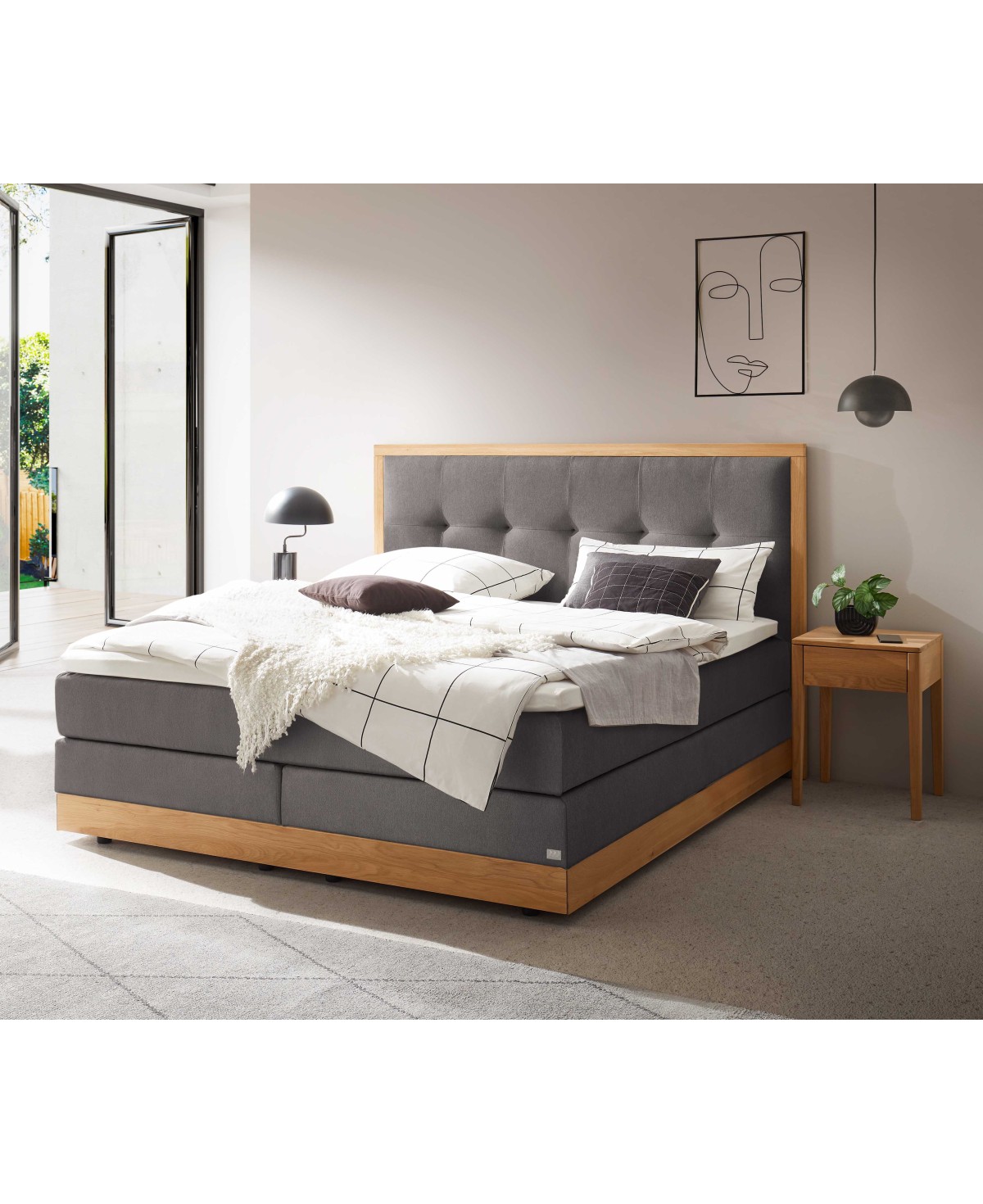 Optisch begeistert Alba mit seiner harmonischen Kombination aus einem hochwertigem Massivholzrahmen am Kopfteil in Eiche bright und einem weichen Stoffbezug in der eleganten Farbe grey. Dieses zeitlose Grau verleiht dem Bett eine moderne, zurückhaltende Ausstrahlung, die sich mühelos in jedes Schlafzimmerambiente einfügt. Der Farbton wirkt klar und stilvoll, ohne aufdringlich zu sein – ein Understatement, das Wärme und Ruhe ausstrahlt. Das gepolsterte Kopfteil mit seiner quadratförmigen Steppung sorgt für eine klare, strukturierte Optik und lädt dazu ein, sich entspannt zurückzulehnen – ob beim Lesen, Fernsehen oder einfach beim Abschalten. Auch um den Korpus verlaufend fasst ein Massivholzrahmen in Eiche bright das Bett edel ein und rundet das Gesamtbild stilvoll ab.