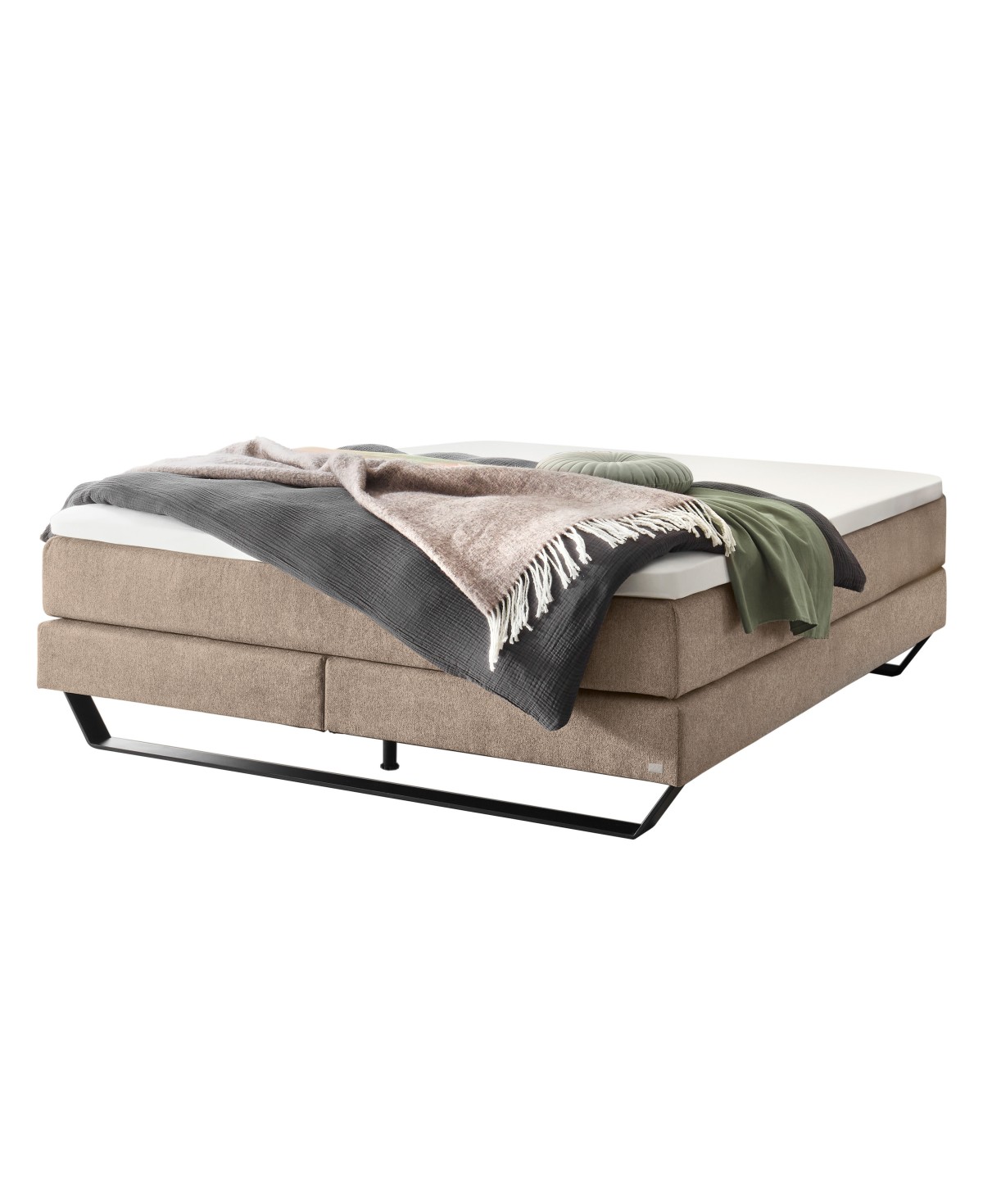 Getragen wird Julieta von einer flachen, schwarzen Metallkufe, die dem Bett eine schwebende Leichtigkeit verleiht und zugleich für zuverlässige Stabilität sorgt. Der markante Kontrast zwischen dem weichen Webstoff, im freundlich hellen Farbton sand, und dem kühlen Metall der Kufen, wirkt urban und elegant zugleich.