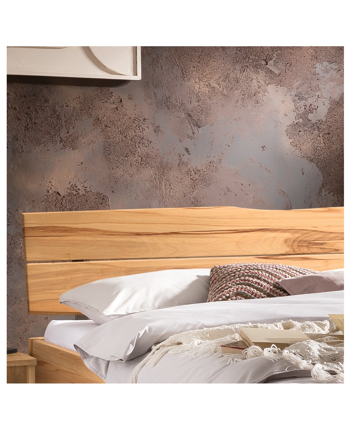 Mit dem lebendigen, massiven Wildbuchenholz, versehen mit natürlich vorkommenden Rissen, Ästen und Markstrahlen, wird das Designbett optimal abgerundet.