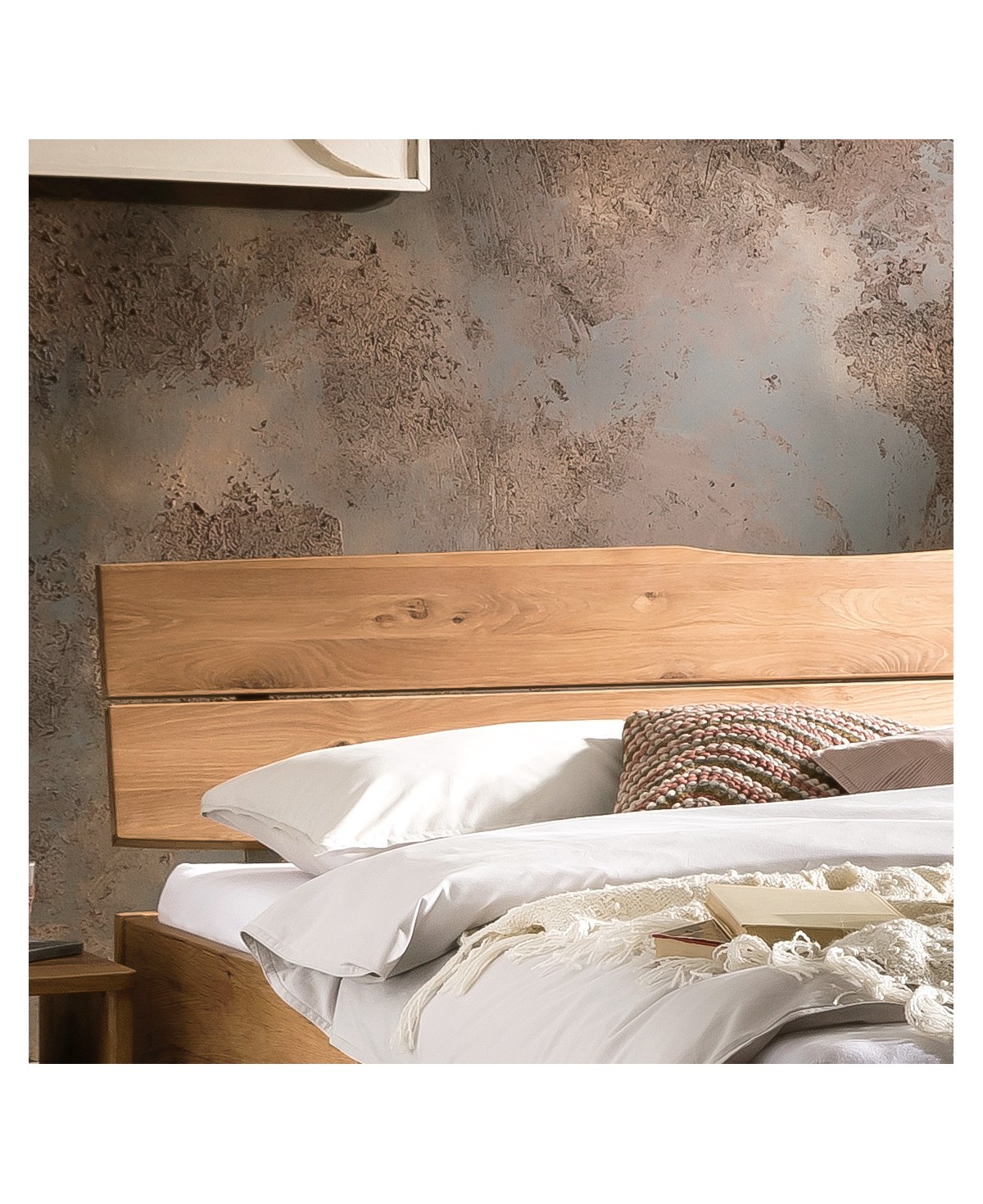 Mit dem lebendigen, massiven Wildeichenholz, versehen mit natürlich vorkommenden Rissen, Ästen und Markstrahlen, wird das Designbett optimal abgerundet.