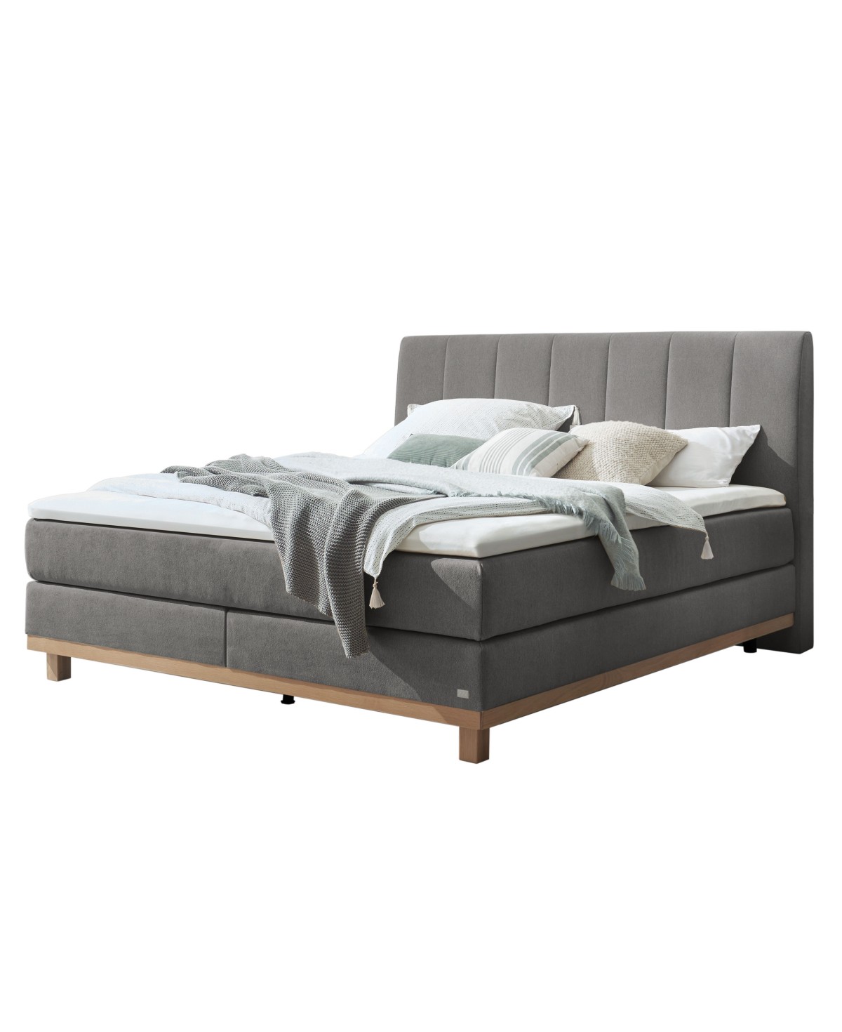 Das Hasena Boxspringbett Estela verbindet klares Design mit hochwertigen Materialien und macht Ihr Schlafzimmer zu einem Ort, an dem Sie gerne zur Ruhe kommen. Die quadratischen Massivholzfüße tragen das Boxspringbett klar und solide, während der umlaufende Holzrahmen dem Bett Struktur und Wertigkeit verleiht. Das hohe Kopfteil mit seiner vertikalen Steppung lädt auch zum Anlehnen ein und betont die elegante Linienführung von Estela. Es wirkt modern und klar.