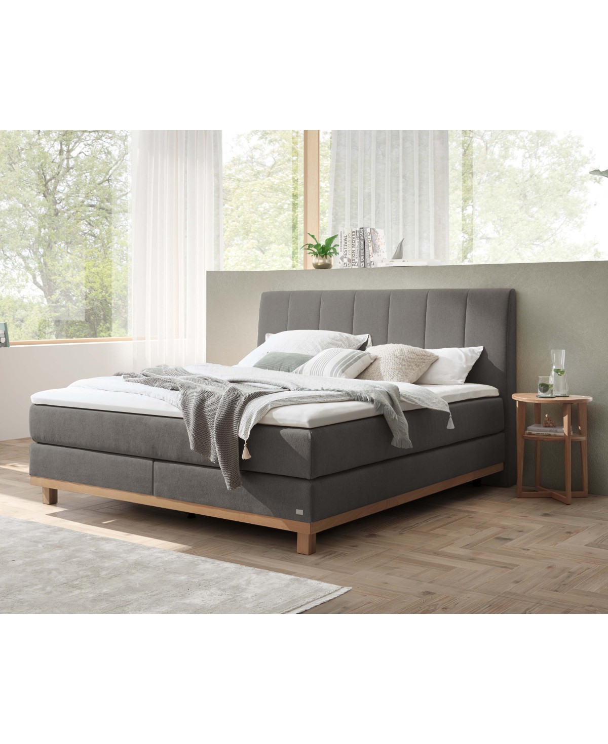 Das Hasena Boxspringbett Estela verbindet klares Design mit hochwertigen Materialien und macht Ihr Schlafzimmer zu einem Ort, an dem Sie gerne zur Ruhe kommen. Die quadratischen Massivholzfüße tragen das Boxspringbett klar und solide, während der umlaufende Holzrahmen dem Bett Struktur und Wertigkeit verleiht. Das hohe Kopfteil mit seiner vertikalen Steppung lädt auch zum Anlehnen ein und betont die elegante Linienführung von Estela. Es wirkt modern und klar.