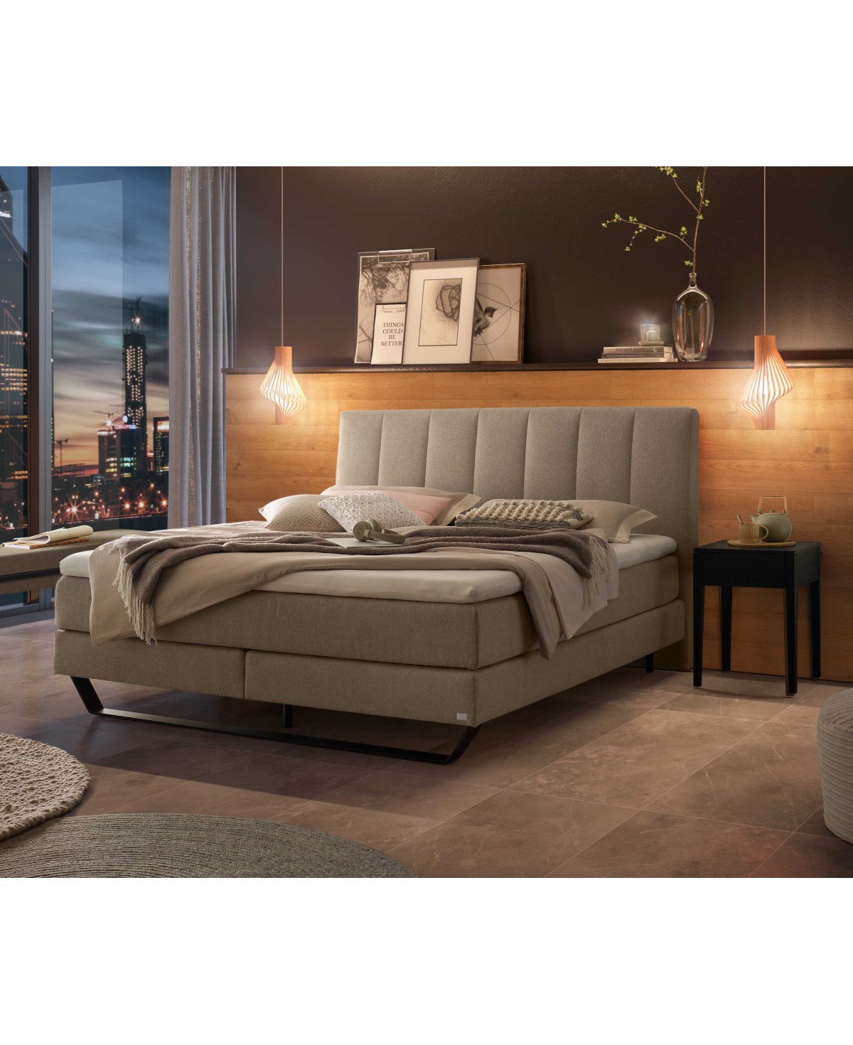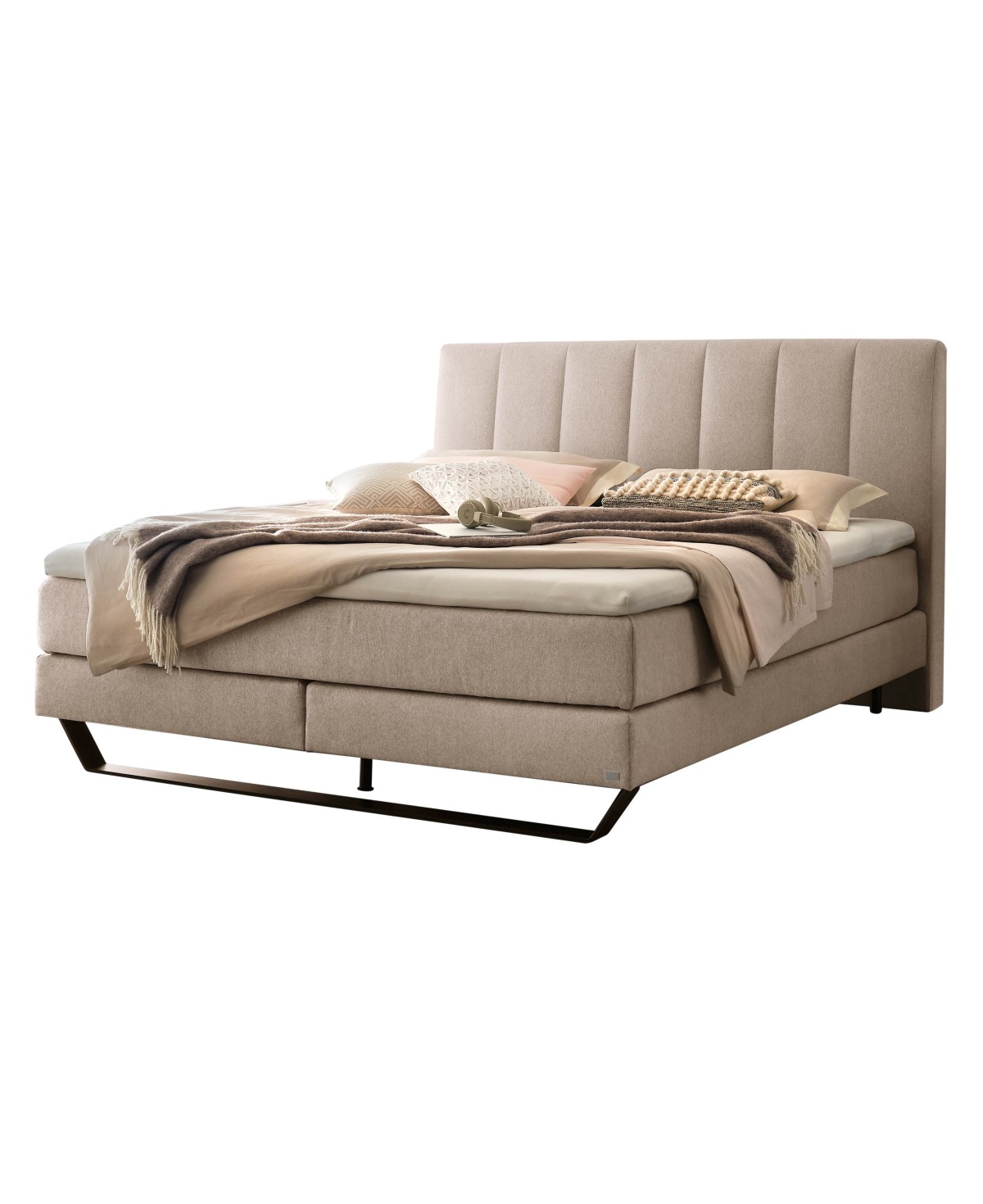 Klares, unaufgeregtes Design geht mit einem edlen Materialmix aus Stoff und Metall einher. Erleben Sie nicht nur traumhaften Schlaf im Hasena Boxspringbett Ambra, sondern gestalten Sie sich ebenfalls ein traumhaft schönes Schlafzimmer mit diesem edlen Hasena Boxspringbett. Die Metallkufe in schwarz setzz einen starken Kontrast zum hellen, freundlichen und wunderbar hautsympathischen Webstoff in der Farbausführung sand. Genießen Sie das hohe Kopfteil mit der vertikalen Steppung, das zum Anlehnen und Entspannen einlädt.