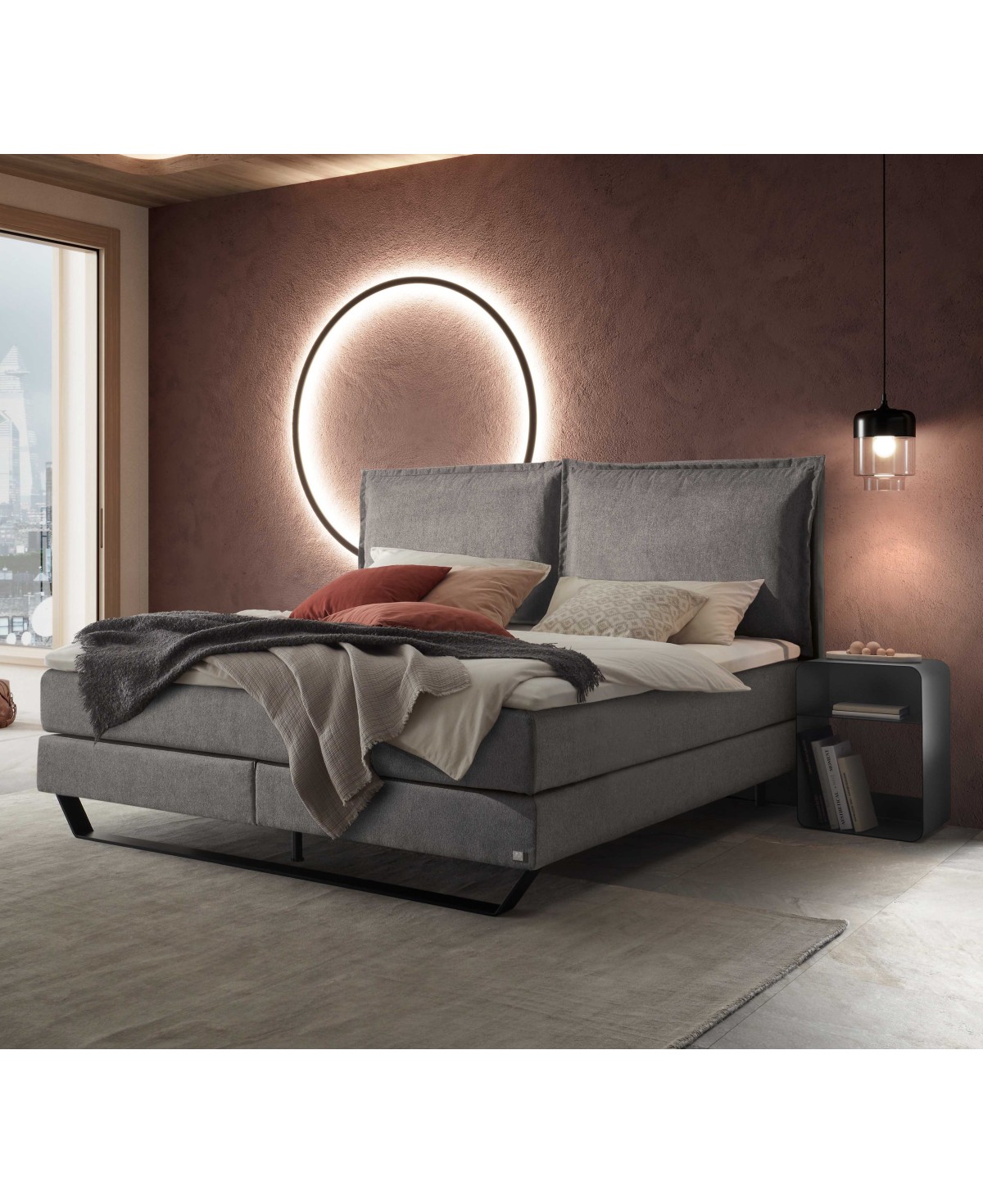 Kuscheln Sie sich nach einem anstrengenden Tag in die weichen Kissen des Hasne Boxspringbettes Celina. Die Kissen sind mit einem Klettverschluss am Paneel befestigt. So wird ein Verrutschen verhindert und sie können bei Bedarf auch abgenommen werden. Das klare und moderne Design von Celina schafft ein tolles Raumambiente und fügt sich perfekt in die unterschiedlichsten Einrichtungsstile ein. Dabei ist die Metallkufe in schwarz ein toller Kontrast zum weichen Webstoff in der Trendfarbe grey.