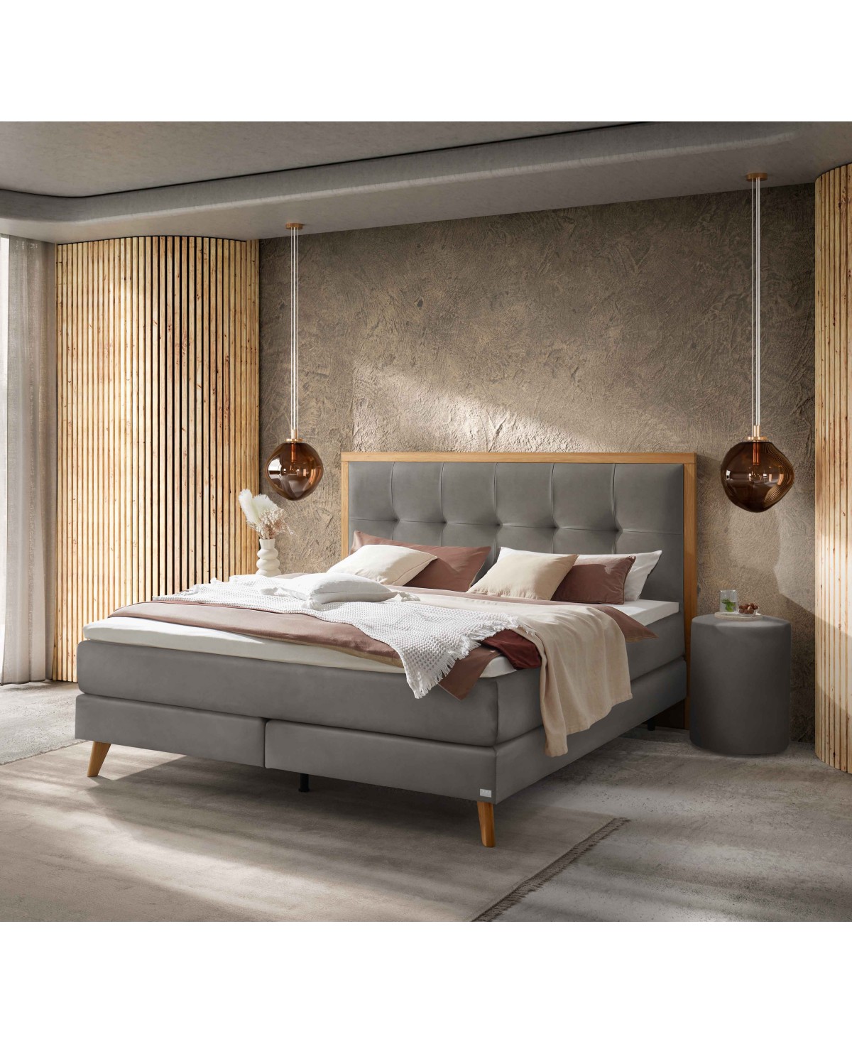 Wenn der Tag zur Ruhe kommt, entfaltet das Hasena Boxsprinbett Marisol seinen ganzen Charme. Das elegante Boxspringbett verbindet Komfort, Design und Qualität auf höchstem Niveau. Das weich gepolsterte Kopfteil mit quadratischer Steppung lädt zum Entspannen ein, während der umlaufende Massivholzrahmen und die fein geformten Holzfüße aus heller Eiche eine optische Leichtigkeit und hervorragende Stabilität vereinen. Für erholsamen Schlaf und eine lange Freude an Ihrem neuen Bett – Nacht für Nacht. Der hochwertige Bezug in Kunstlederoptik mt seiner feinen Narbung, verleiht dem Boxspringbett eine edle und zeitlose Optik.