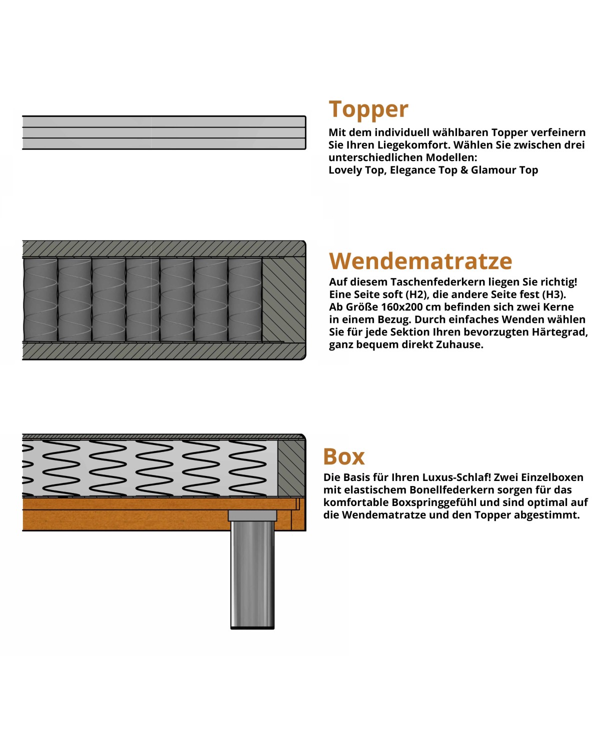 Mit dem passenden Topper runden Sie Ihr Hasena Boxspringbett Stefania individuell auf Ihre Schlafbedürfnisse ab. Sie haben die Wahl zwischen drei verschiedenen Modellen: fest (Lovely Top), medium (Elegance Top) und soft (Glamour Top). So verleihen Sie Ihrem Boxspringbett einen individuellen Charakter und bestimmen selbst, wie Sie gerne liegen möchten. Die wendbare Taschenfederkernmatratze mit zwei Härtegraden und der passende Topper in drei Festigkeiten können für viele unterschiedliche Körpertypen verwendet werden. Auch können Schläfer mit höherem, als auch mit niedrigerem Körpergewicht einen angenehm erholsamen Schlaf erleben.