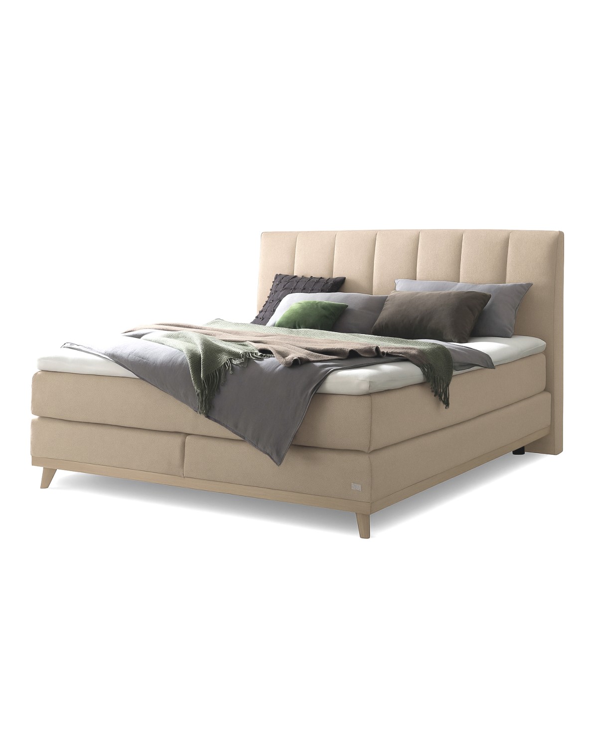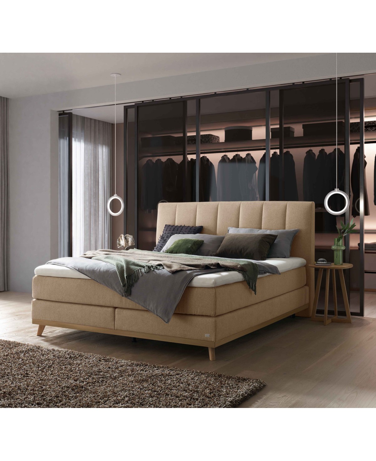 Einfach zur Ruhe kommen und entspannen. Mit dem Hasena Boxspringbett Stefania machen Sie Ihr Schlafzimmer zur Erholungsoase. Schickes Design, hochwertige Materialien und eine feine Verarbeitung schaffen ein Bett der Spitzenklasse. Die filligran und leicht schräg verlaufenden Füße und der umlaufende Rahmen aus hellem und fein gemasertem Eichenholz sind perfekt aufeinander abgestimmt und passen hervorragend zum wunderbar hautsympathischen Stoffbezug in der freundlichen Farbe sand.