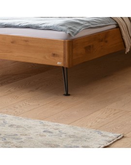 Für eine natürliche Atmosphäre im Schlafzimmer kann mit dem Hasena Lounge Designbett Locarno gesorgt werden. Ein besonderes Highlight des Locarno Bettes ist das leicht geschwungene Kopfteil, das dem Bett eine ruhige, ausgewogene Silhouette verleiht. Es harmoniert wunderbar mit dem Bettrahmen mit abgerundeten Ecken und den schlanken, schräg verlaufenden Metallfüßen, die eine luftige und elegante Atmosphäre in den Schlafraum bringen. Die lebendige Struktur des Wildeichenholzes, versehen mit gewollten Rissen, Ästen und Markstrahlen, rundet das Bett optimal ab.