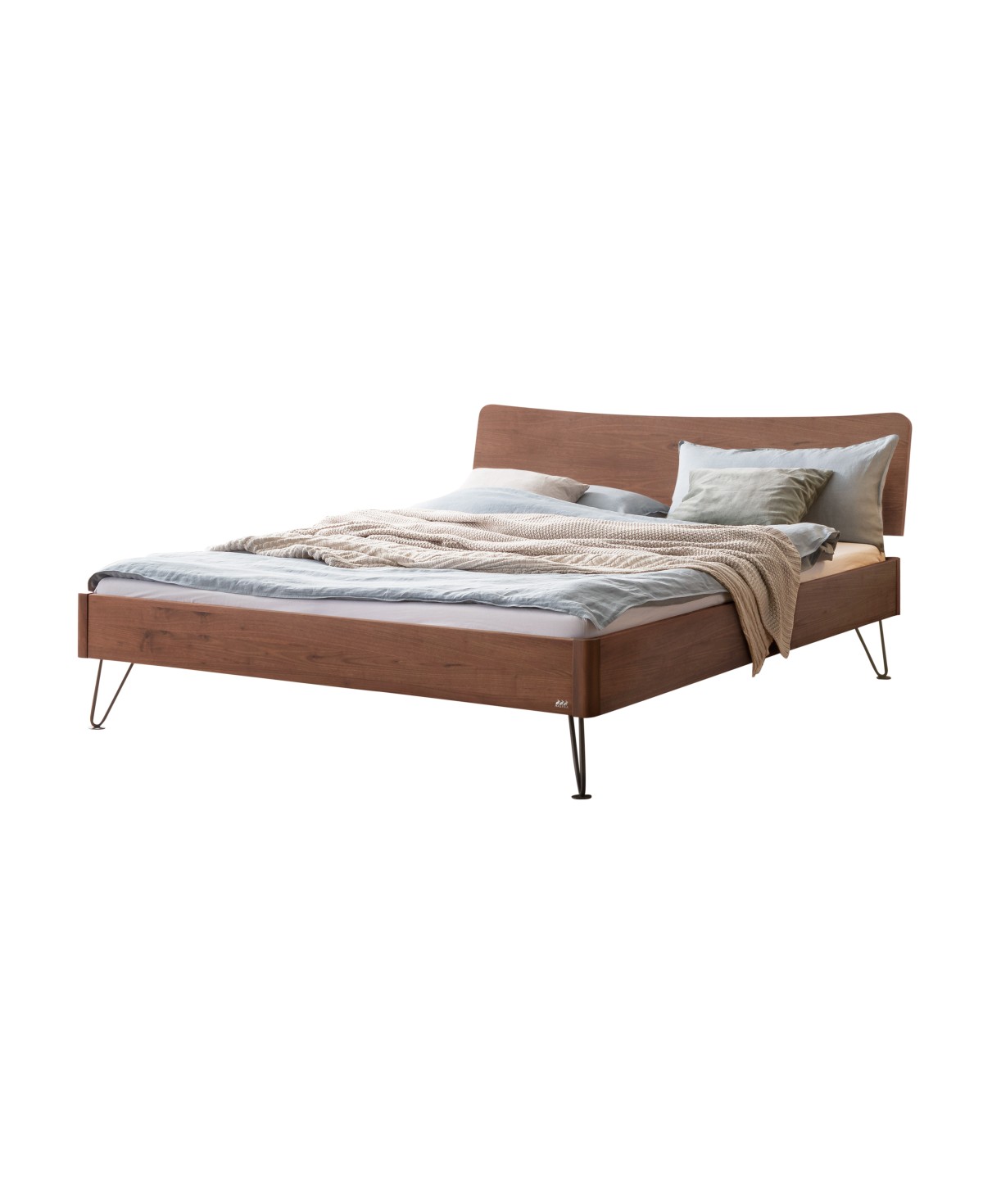 Mit dem edlen, dunklen Nussbaumholz wird das Hasena Lounge Designbett Locarno zum Mittelpunkt im Schlafzimmer. Ein besonderes Highlight des Locarno Bettes ist das leicht geschwungene Kopfteil, das dem Bett eine ruhige, ausgewogene Silhouette verleiht. Es harmoniert wunderbar mit dem Bettrahmen mit abgerundeten Ecken und den schlanken, schräg verlaufenden Metallfüßen, die eine luftige und elegante Atmosphäre in den Schlafraum bringen.