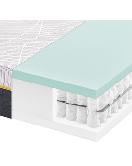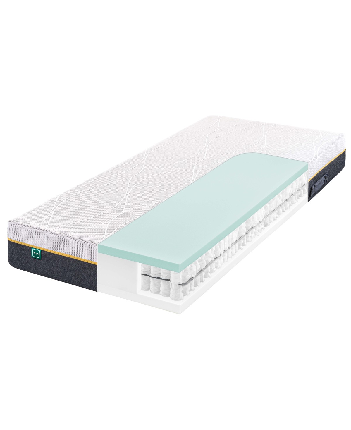 Einfach praktisch: die Lunora Fresh T bietet zwei Liegehärten in einer komfortablen Taschenfederkernmatratze in angenehmer Komforthöhe mit ca. 22 cm. Eine mittelfeste Schaumabdeckung auf der Oberseite, sowie eine feste Schaumplatte auf der Unterseite machen es möglich. Die grüne Oberseite aus weicherem Hybridschaum (ca. 3,5 cm) schafft ein angenehm druckentlastendes Liegegefühl, während der 7-Zonen-Taschenfederkern (ca. 15 cm ) darunter den Körper an den wichtigen Punkten abstützt. Die weiße Schaumabdeckung aus Komfortschaum (3 cm) bietet ein festes Liegegefühl. Die einzeln in Taschen eingepackten Federn in 7-Zonen Aufteilung bieten eine körpergerechte Anpassung und gute Durchlüftung der Matratze.