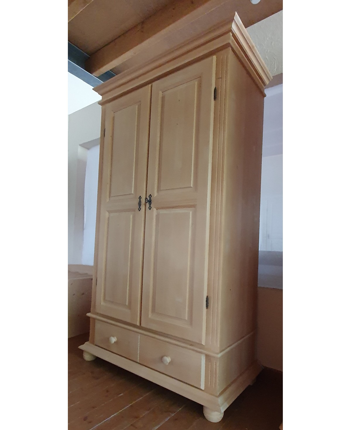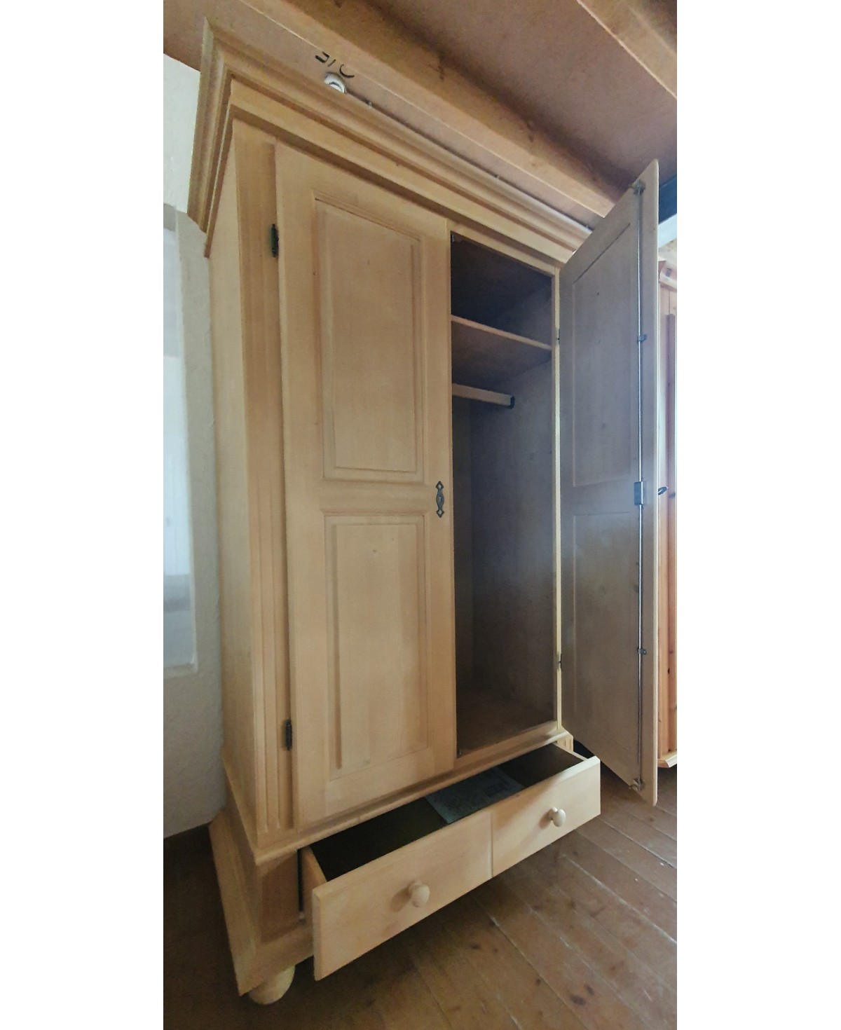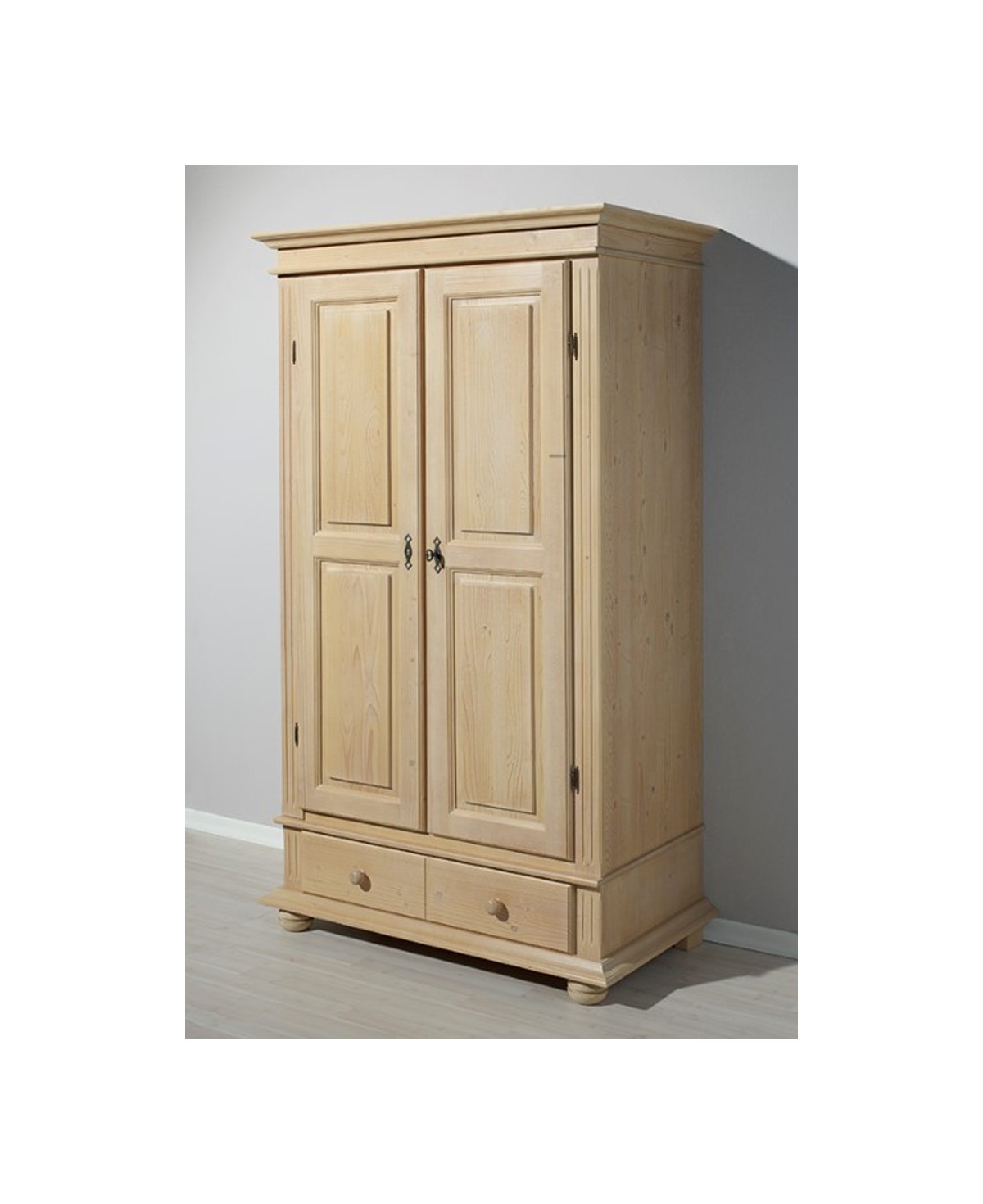 Rustikaler Massivholz Kleiderschrank und Dielenschrank aus Fichtenholz, natur gewachst. Sehr funktional durch einen Boden und eine Kleiderstange mit verschließbaren Türen mittels Stangenschloss, und einer darunterliegenden Schublade mit zwei Knäufen. Ob im Schlafzimmer, in der Diele oder im Gästezimmer - dieser hochwertige Massivholzschrank aus Fichte in der klassichen Farbgebung natur Rosner 138 bietet viele Einsatzmöglichkeiten für die Aufbewahrung Ihrer wichtigen Dinge.