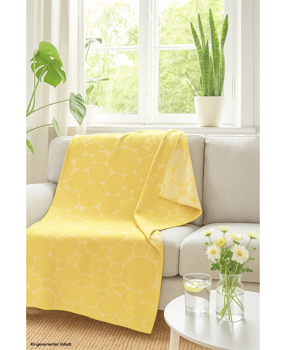 Das Plaid Bubbles in messingfarben von Eagle Products bringt sommerliche Leichtigkeit und stilvolles Design in Ihr Zuhause. Die hochwertige Materialmischung aus 49% Baumwolle, 46% Merino-Schurwolle und 5% Kaschmir sorgt für ein besonders weiches, angenehmes Hautgefühl – ideal zum Einkuscheln auf dem Sofa, als Überwurf auf dem Bett oder als stilvolle Ergänzung auf der Terrasse.