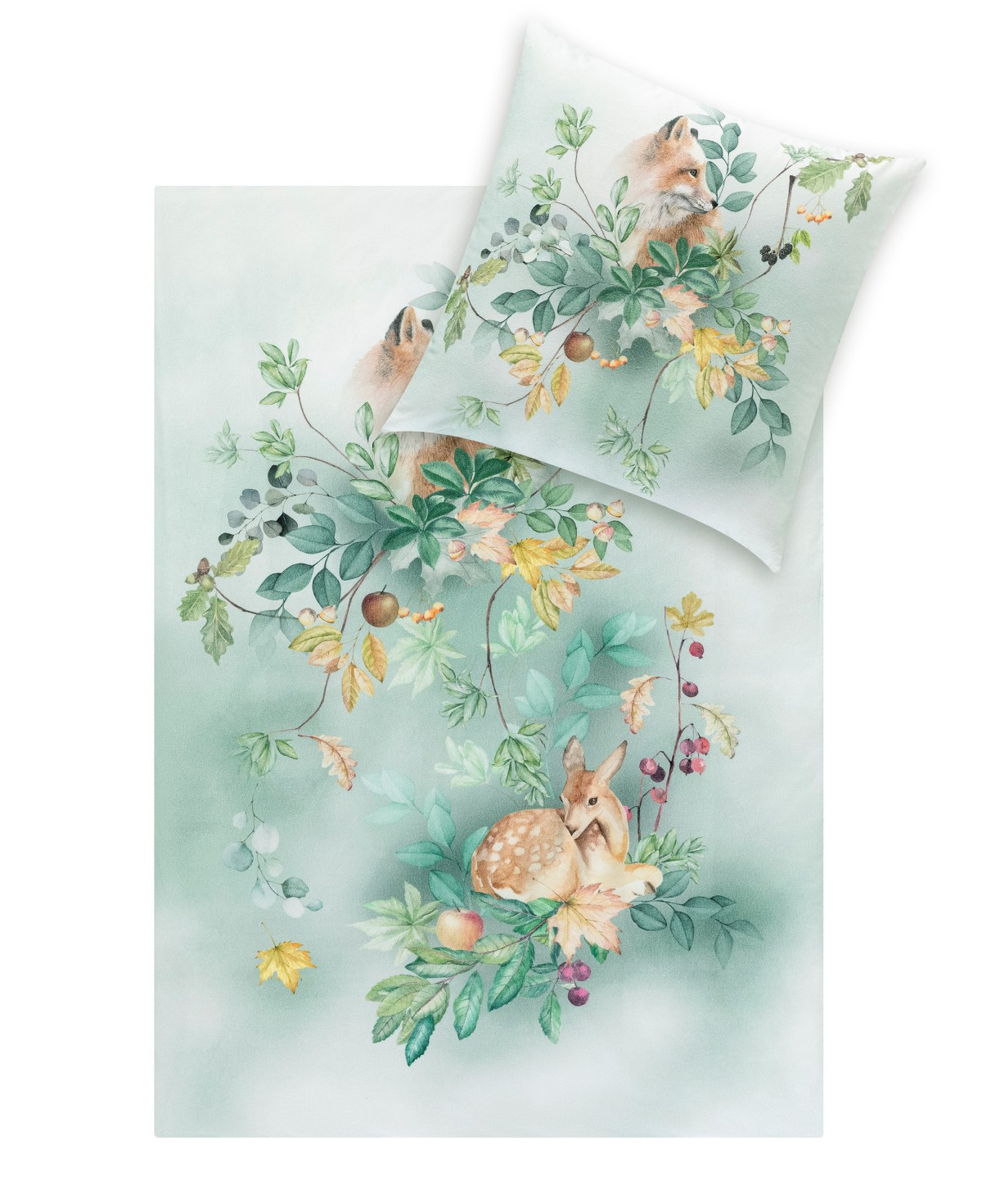 Das märchenhafte Design der Estella Kuschelflanell Bettwäsche Ferdinand veredelt durch die liebevoll gestalteten Aquarellillustrationen eines Rehkitzes, eines Fuchses und detaillierter Waldpflanzen jedes Schlafambiente.