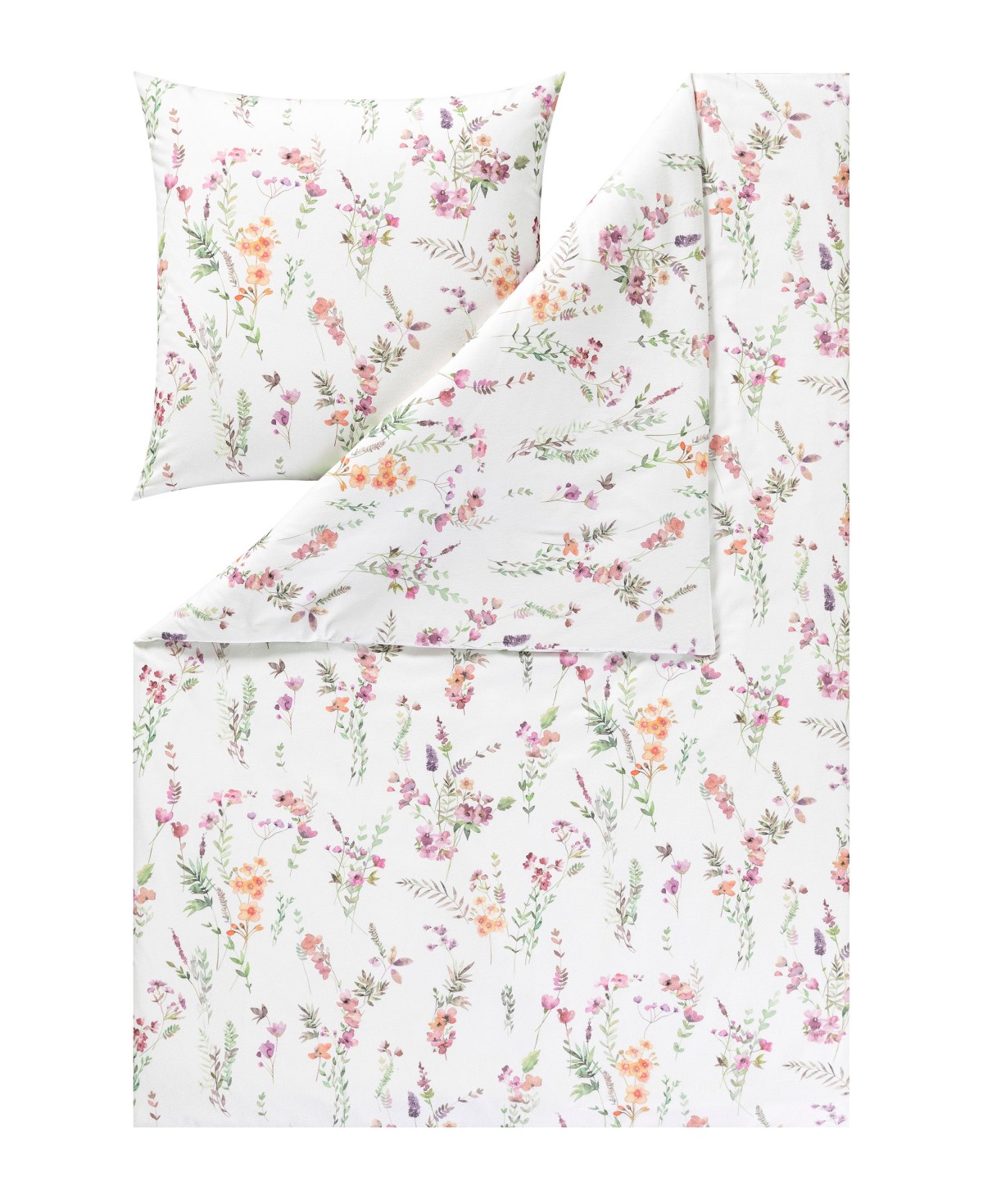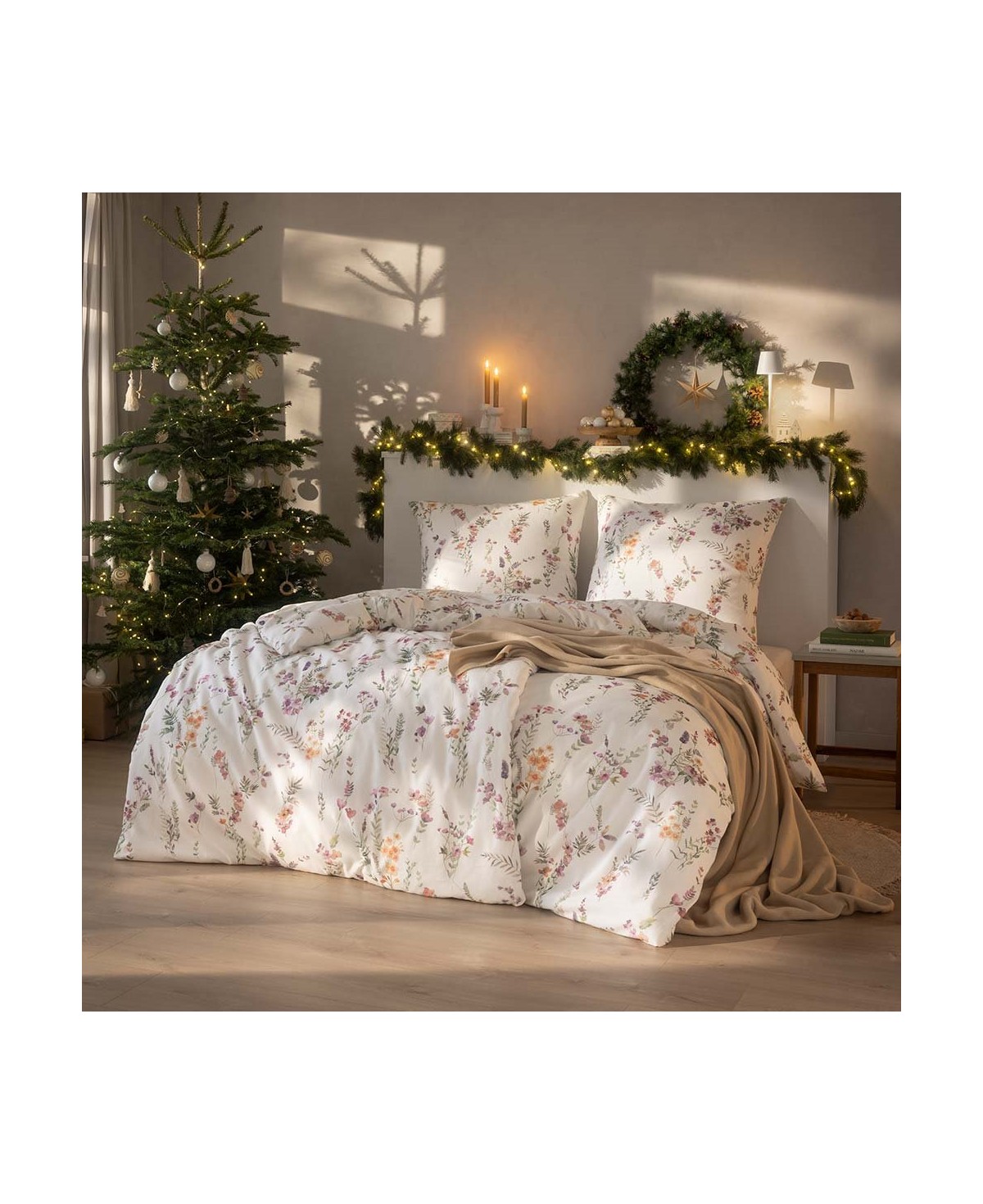 Das zarte Muster aus feinen Wiesenblumen in sanften Farbnuancen in Lila, Rosa und Orange harmoniert wunderbar mit dem naturweißen Hintergrund, verleiht dem Schlafraum eine dezente, verspielt-romantische Atmosphäre und lässt den Winter für einen Moment vergessen.