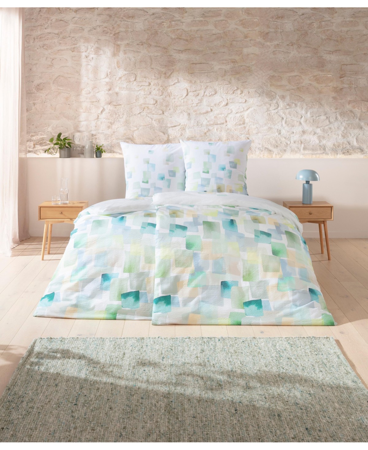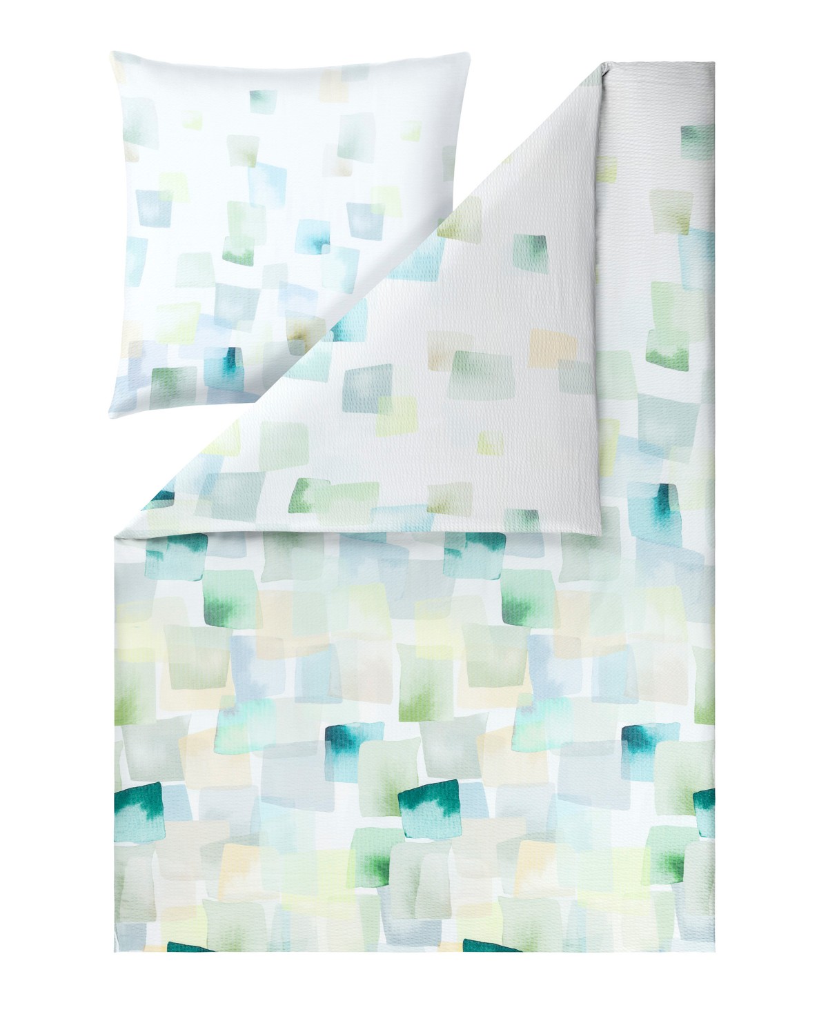Das grafisch inspirierte Design der Estella Seersucker Bettwäsche Rupert sorgt mit seinem sanften Farbspiel aus Grün- und Aquatönen für eine frische und ausgeglichene Atmosphäre.