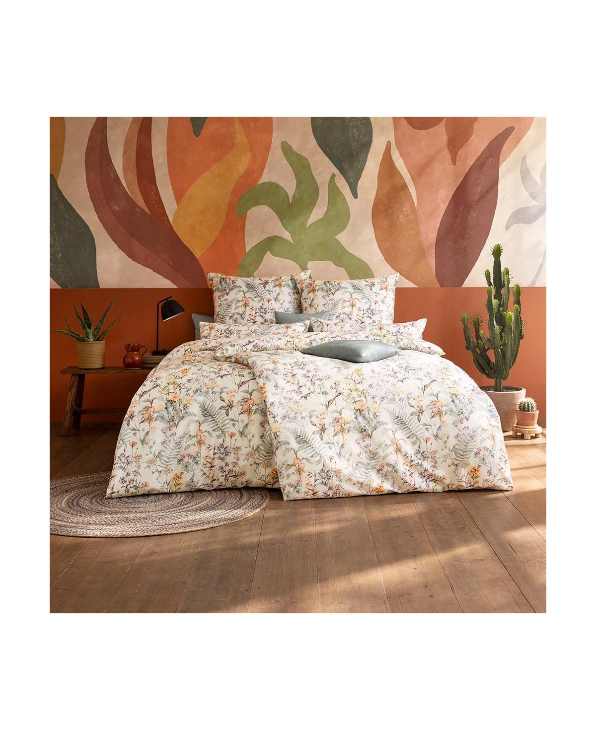 Die Estella Mako Satin Bettwäsche Cordula bringt mit den auf ihr thronenden Farnblättern und zarten Blumen in sanften Apricot-, Violett- und Salbeitönen, ein Gefühl von verspielter Romantik ins Schlafzimmer.